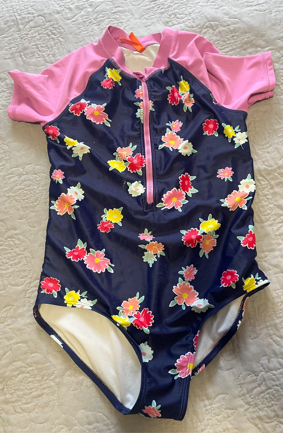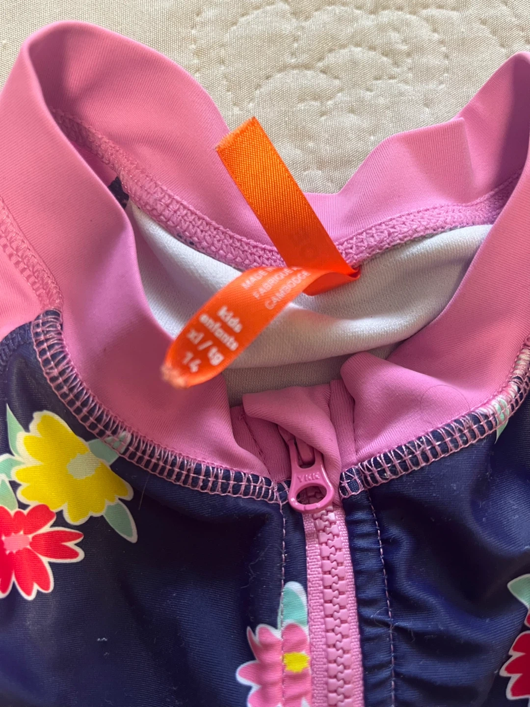 A cute swimsuit for kids, perfect for swimming lessons or a day at the beach! It's a size XL, which is equivalent to a size 14. The swimsuit features a fun floral pattern with pink sleeves.