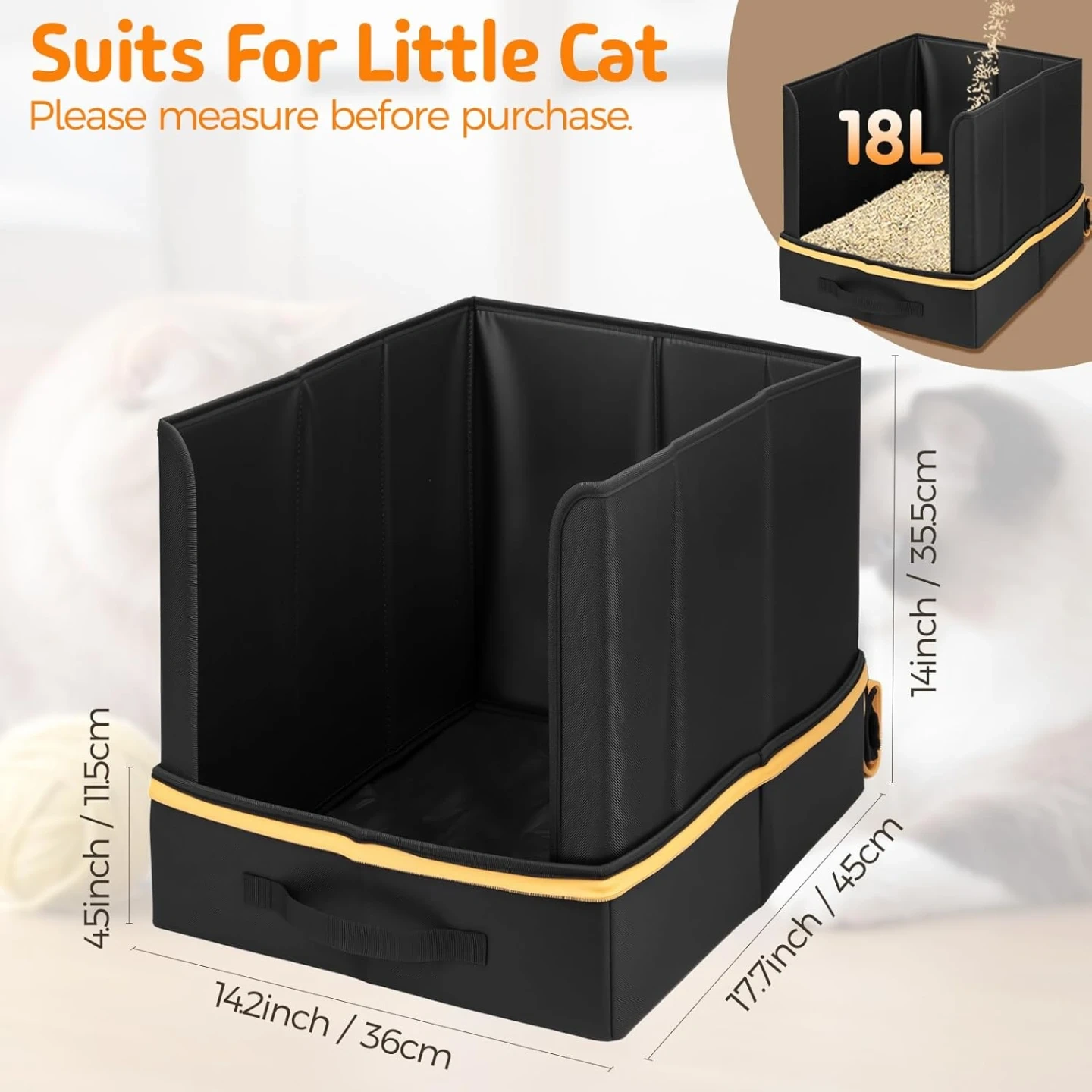 PERFECT CAT LITTER BOX SIZE: With dimensions of 17.7" L x 14.2" W x 14" H, our portable cat litter box offers a roomy space that lets your cat stretch, turn, and dig freely. Spacious enough for cats to use comfortably yet compact when folded, making this portable litter box perfect for cars, vacations, and outdoors.