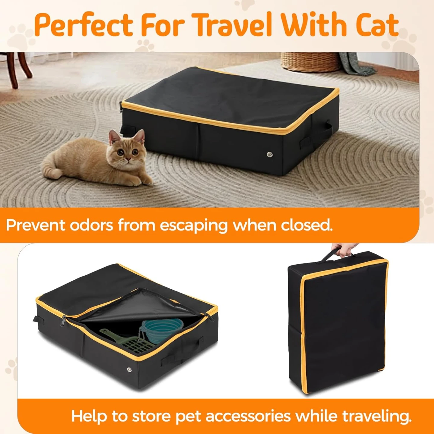 ODORLESS & EASY TO CLEAN: The seamless interior and smooth surface prevent leaks, contain unpleasant odors effectively, and allow for quick and simple wiping clean. More than just a travel litter box, it can also function as a temporary bed or a sturdy storage container for pet supplies during your journeys.