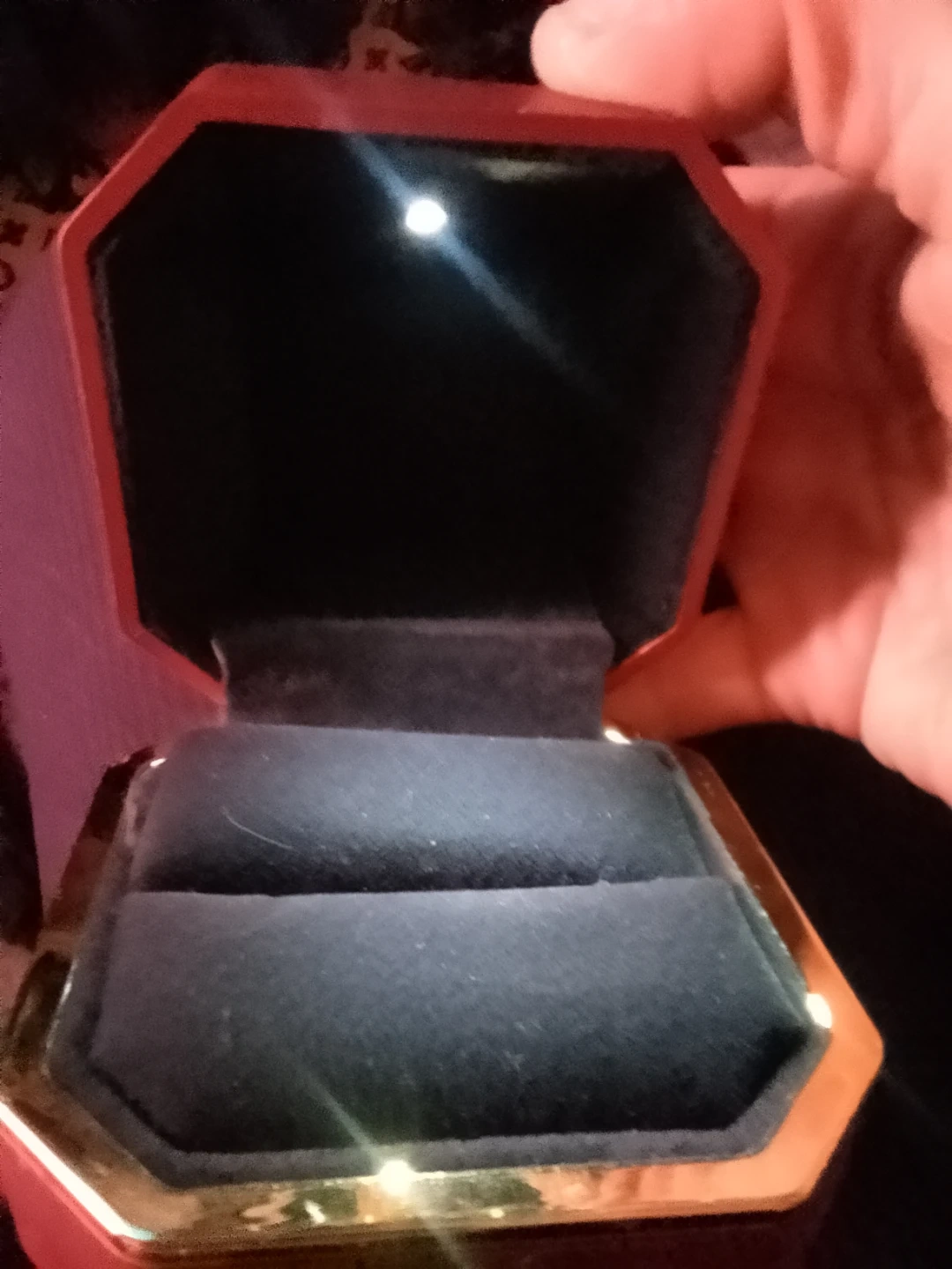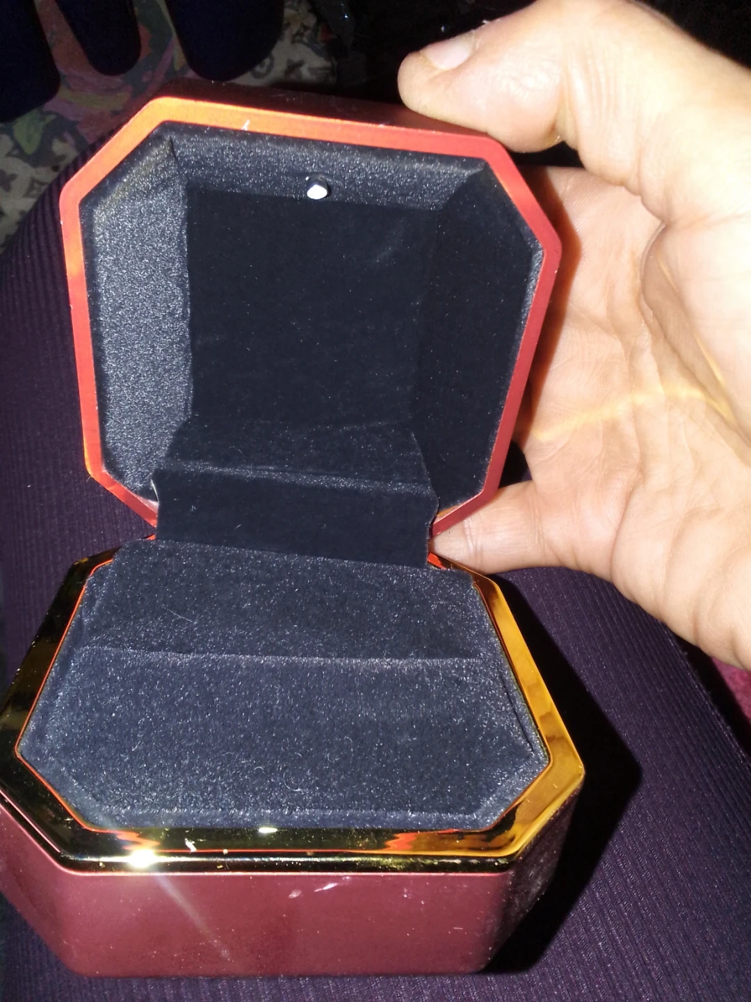 Selling a Royal Dubai Jewellers ring box. It's a red box with gold trim and a black velvet interior. Perfect for storing or gifting a ring!