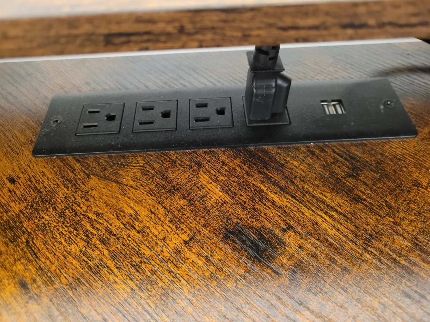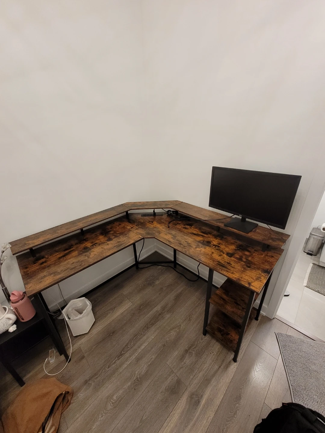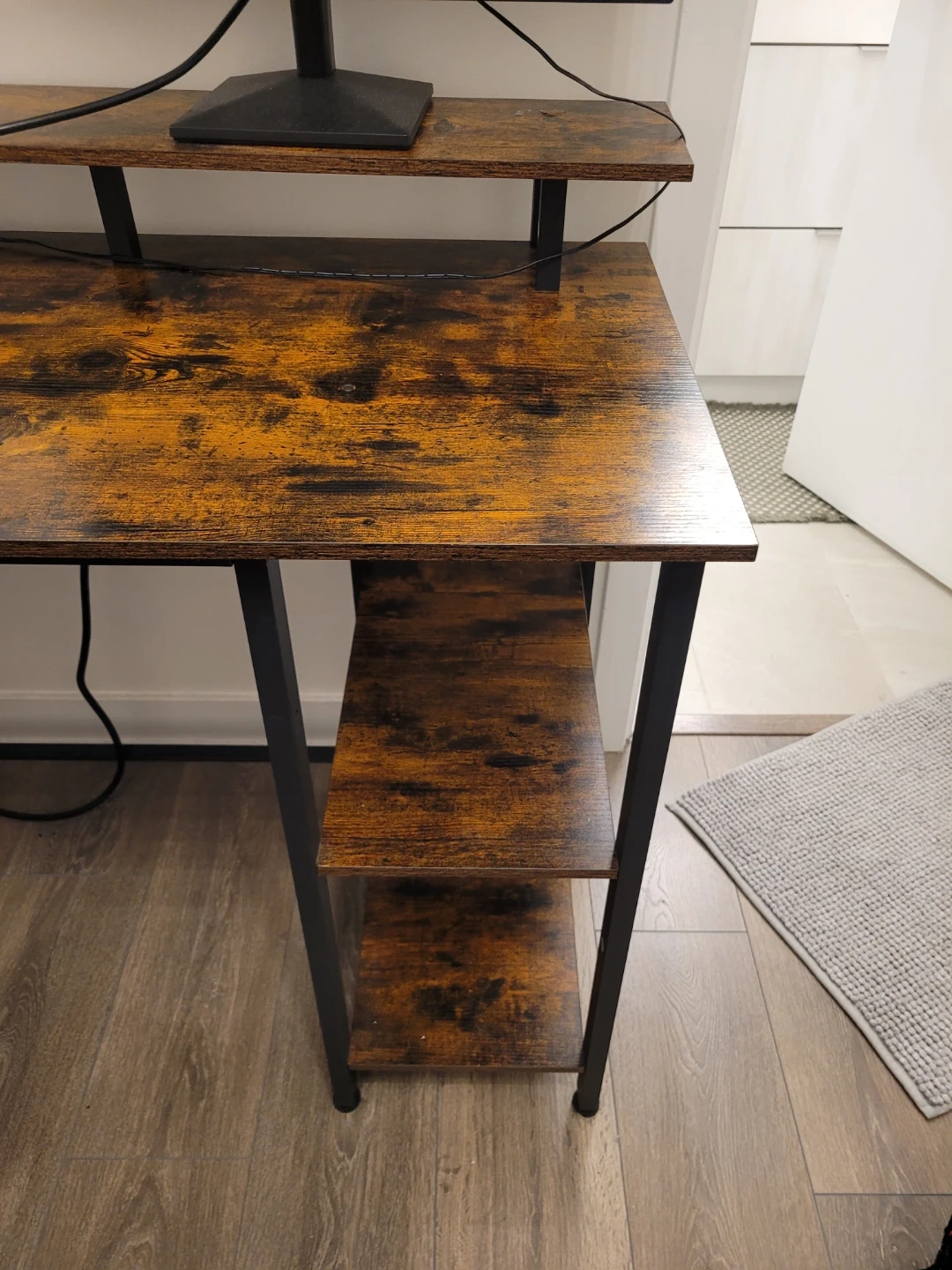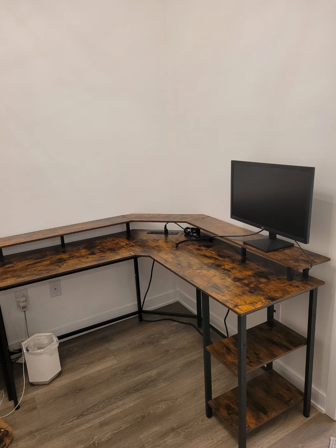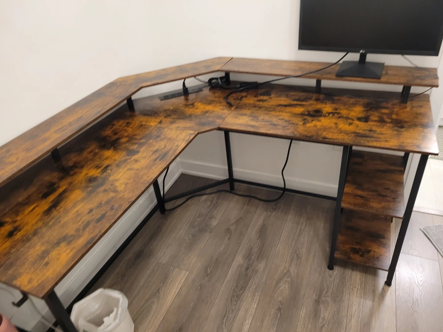 Selling a brown, L-shaped corner desk! It features a unique wood grain design and black metal frame. The desk also has built-in shelves on one side for extra storage and a power strip for your devices. Perfect for a home office or gaming setup!