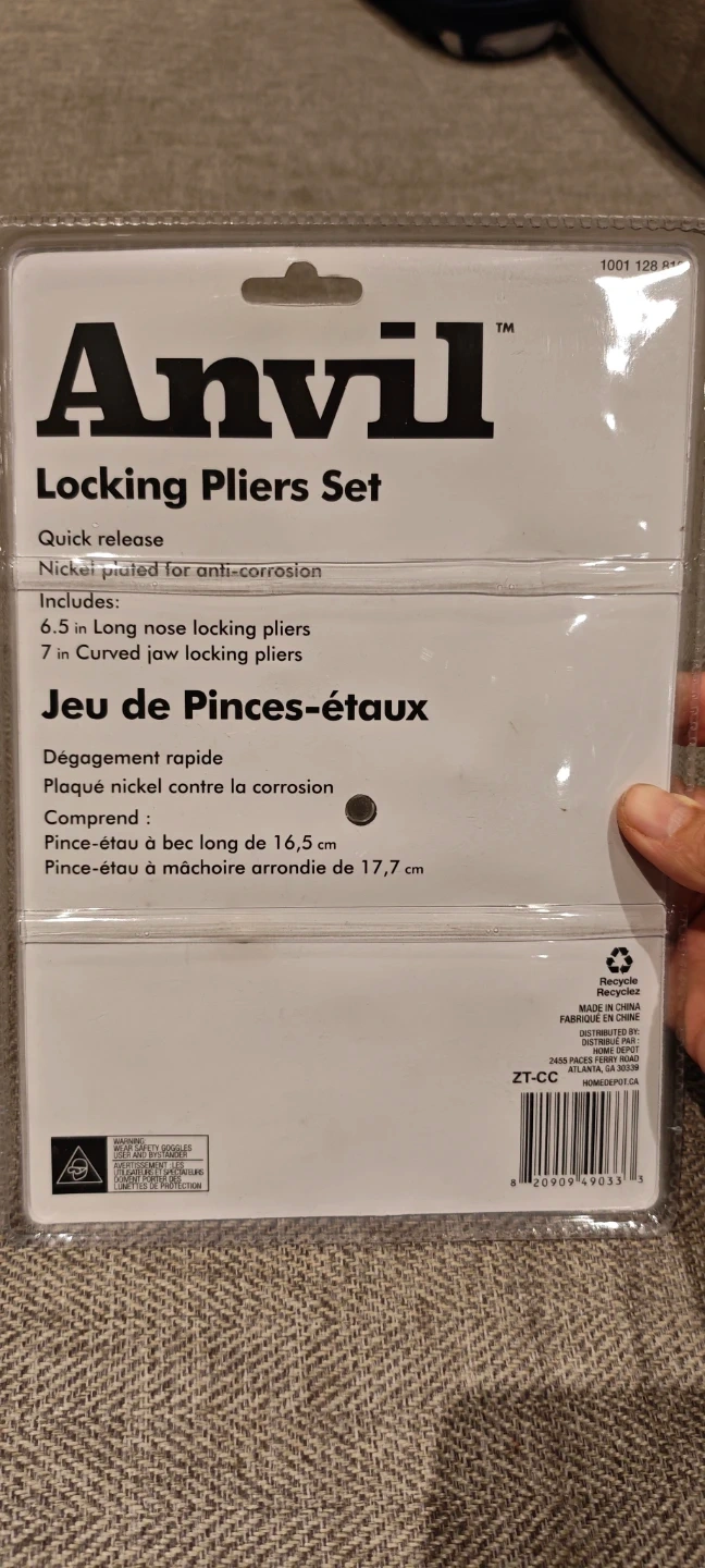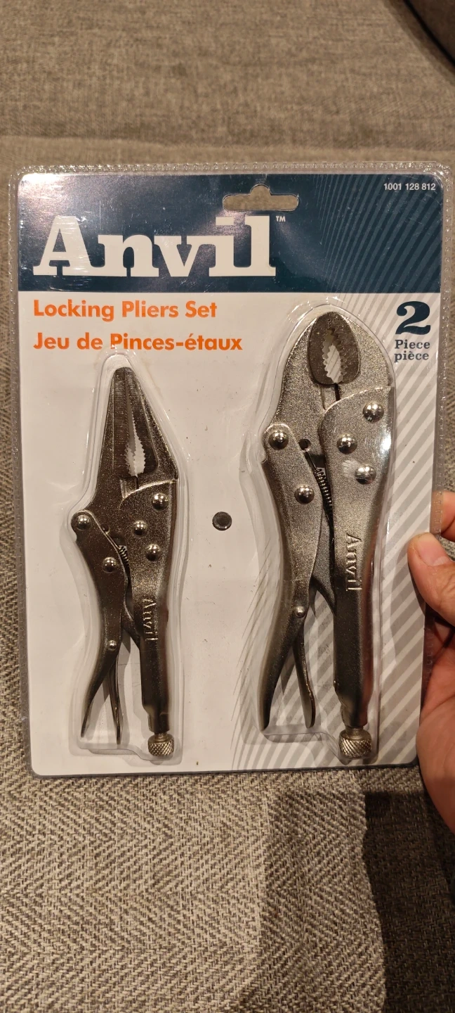 I'm selling a brand new Anvil Locking Pliers Set! This set includes two pieces: a 6.5-inch long nose locking pliers and a 7-inch curved jaw locking pliers. They feature a quick release and are nickel-plated for anti-corrosion. The set is still in its original packaging.
