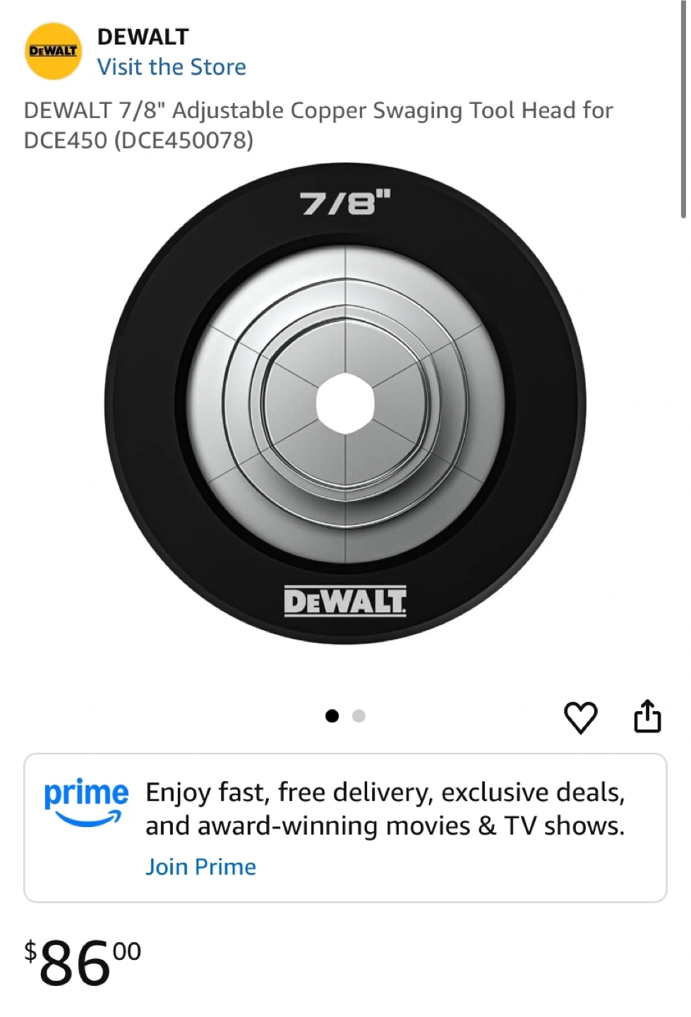 Selling a DeWalt DCE450078 7/8" Adjustable Copper Swaging Tool Head. This tool head is designed for the DCE450 and is in great condition. Originally bought for $86