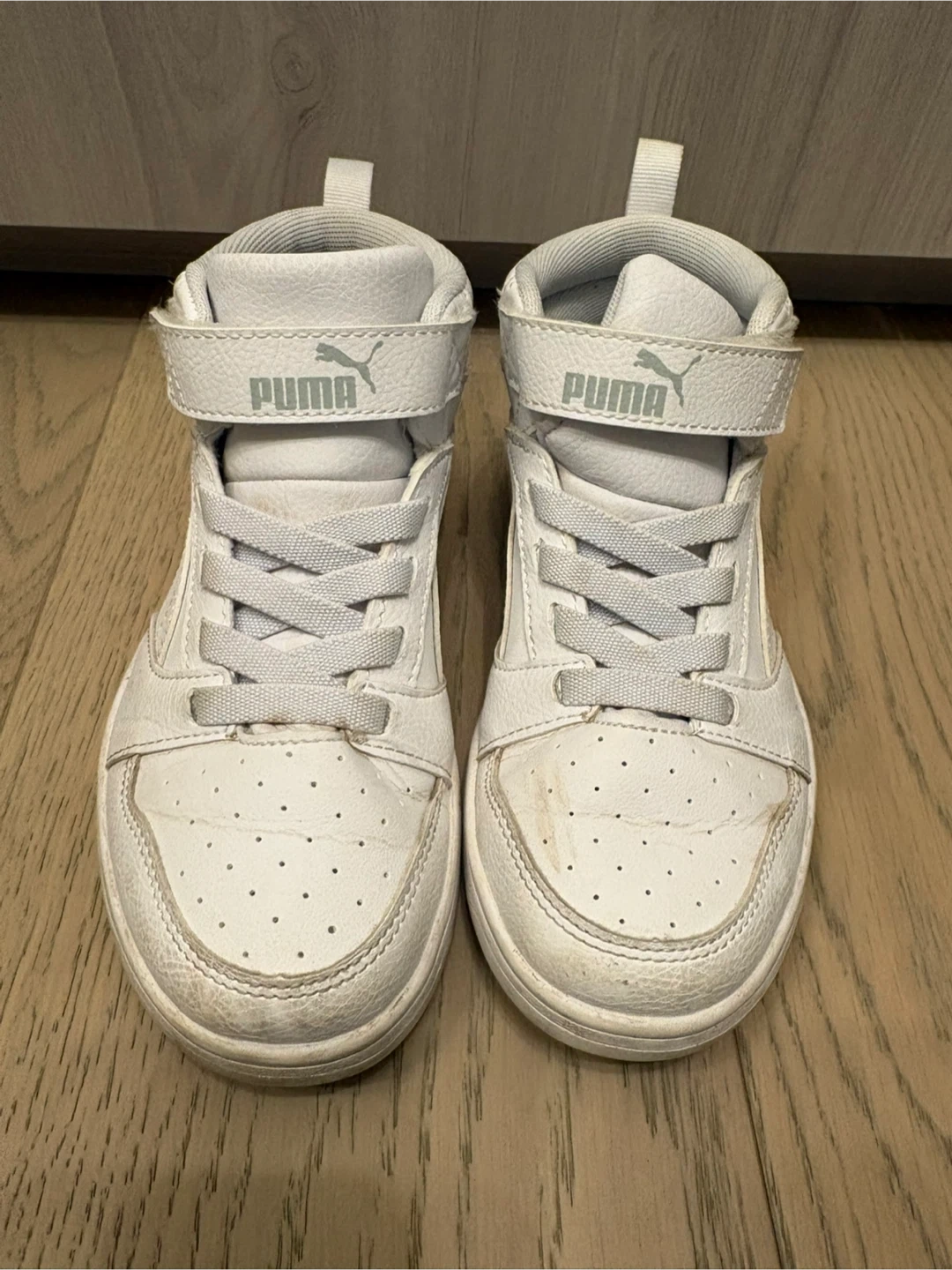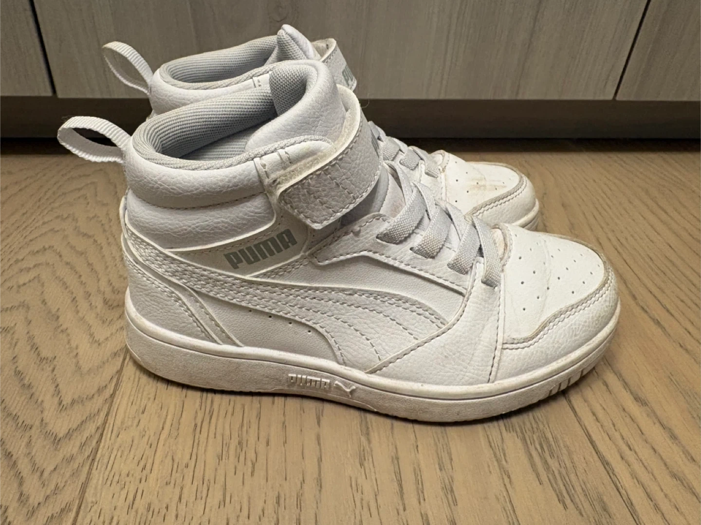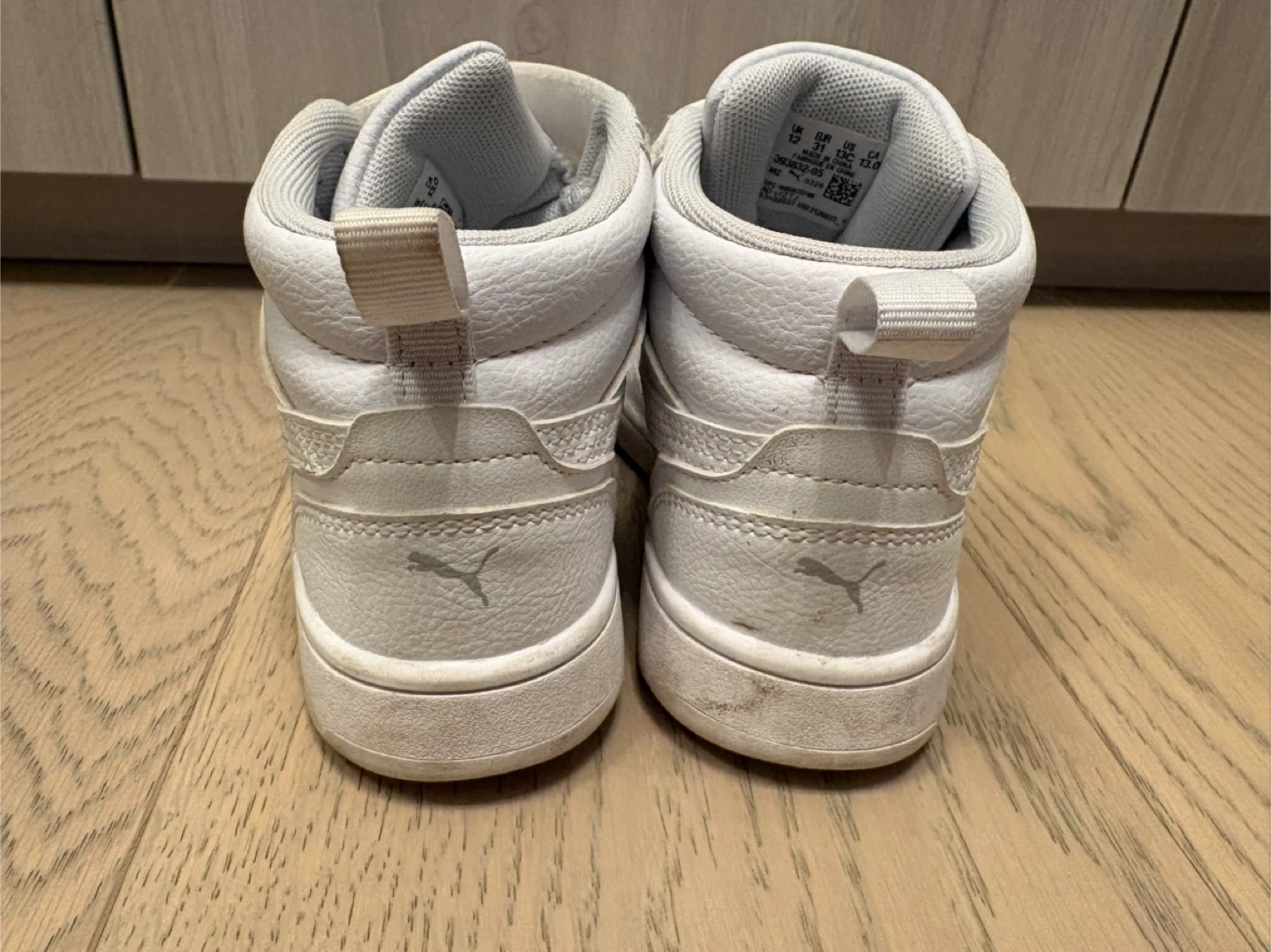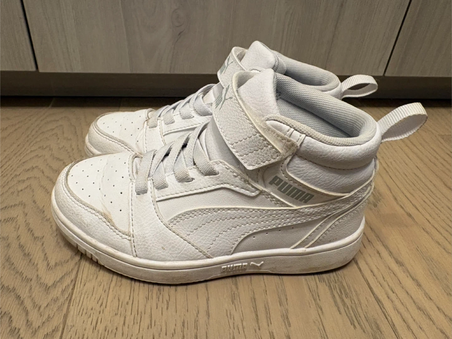 Selling a pair of Puma Rebound Street V2 high-top sneakers in a size US 13. They are white and show some signs of wear, as you can see in the photos. Still lots of life left in them!