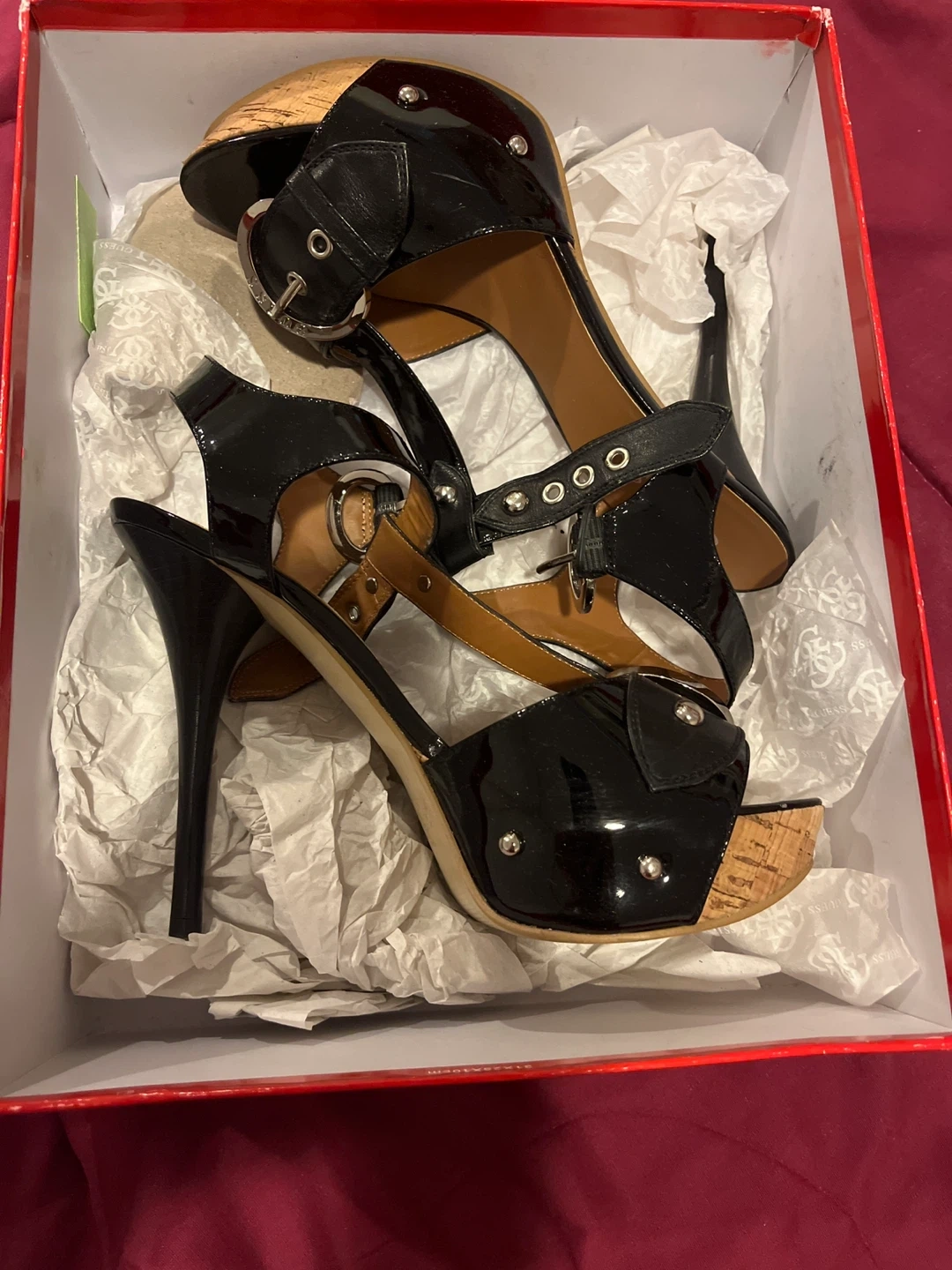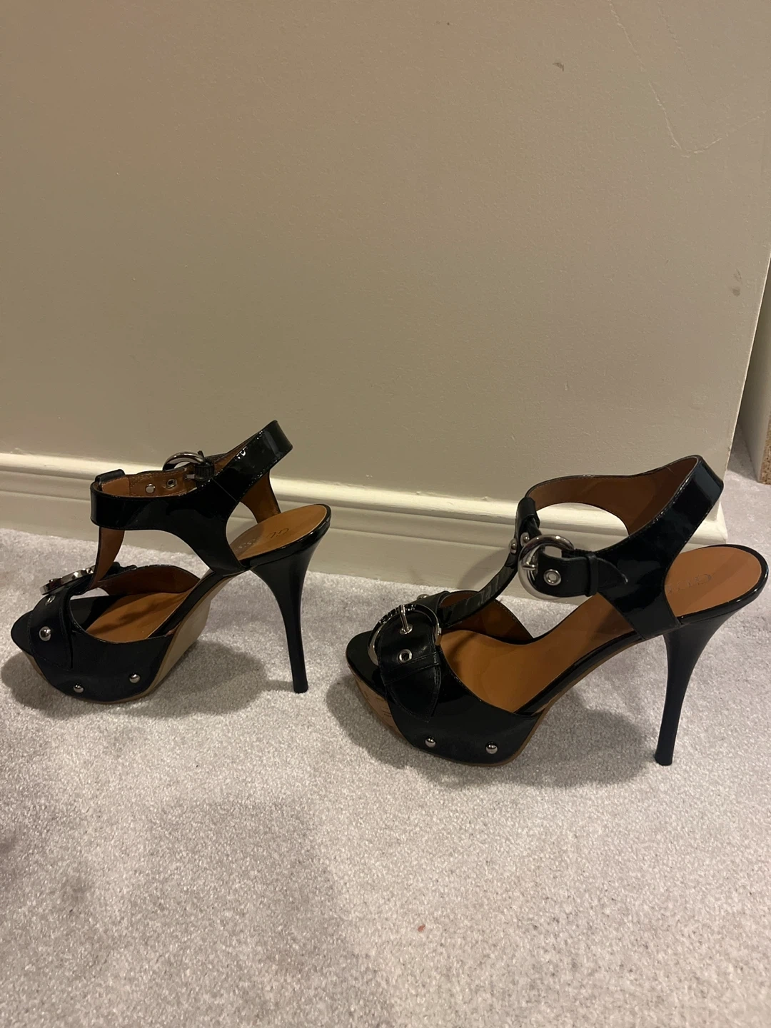 Selling a pair of Guess black heeled sandals. They come in their original box. These stylish platform heels are perfect for a night out!