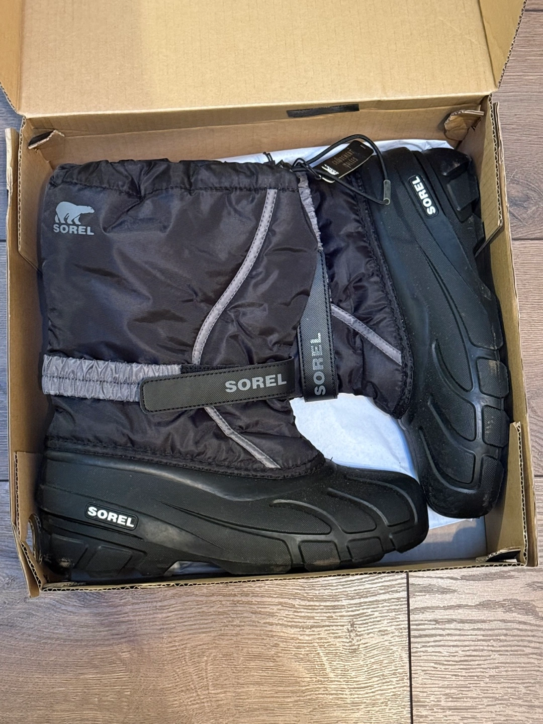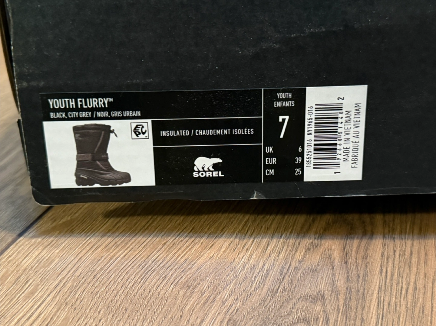 Selling a pair of Sorel Youth Flurry winter boots in size 7. They come in black and city grey, and are insulated for extra warmth. Brand new with tags.