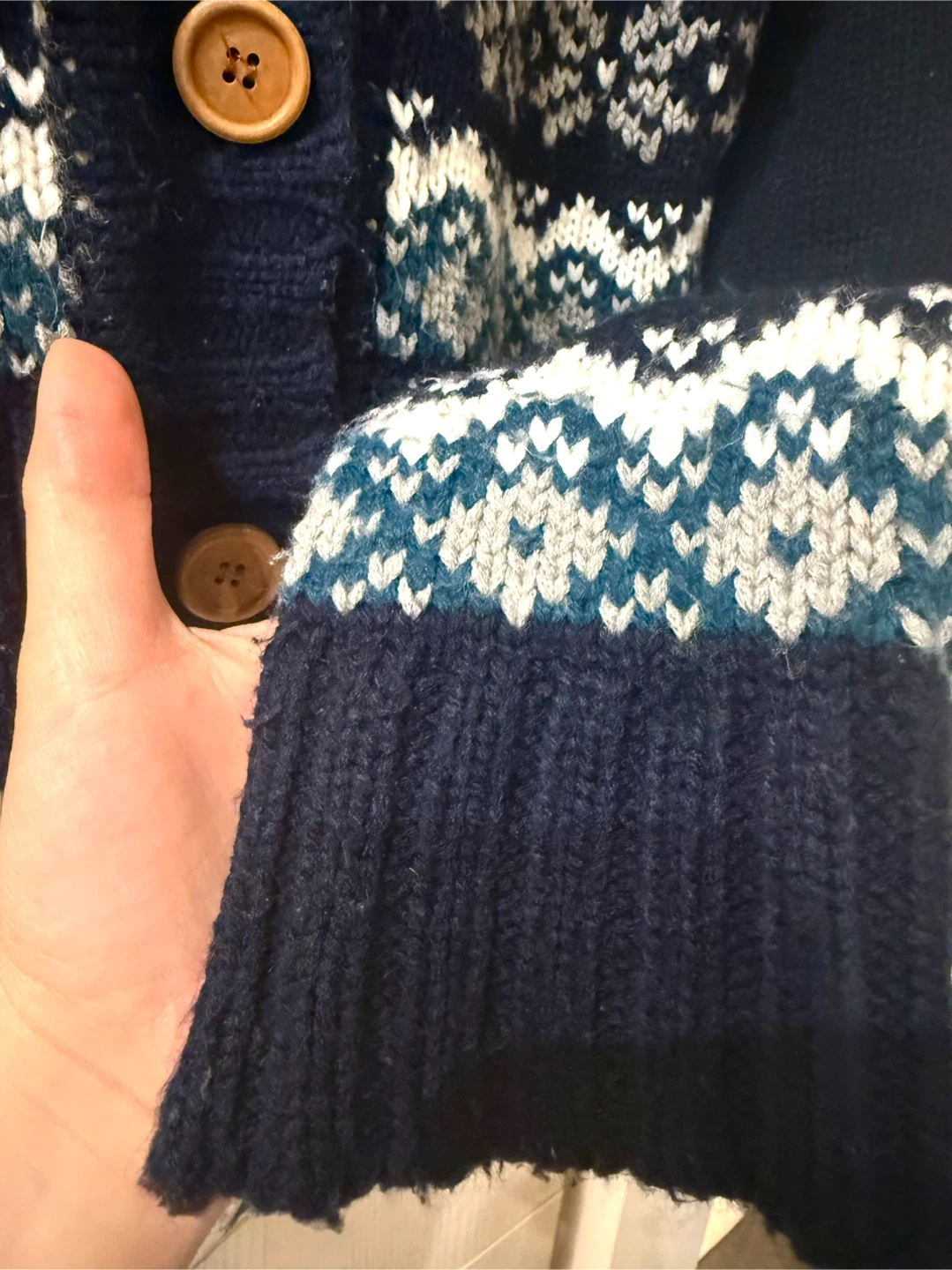 Cozy hooded knit cardigan featuring a lovely blue and white pattern! It has wooden buttons down the front and a cute cropped fit. Perfect for layering on those chilly days!