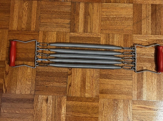 Get ready to pump some iron with this classic five-spring chest expander! It's in used condition, ready for you to add some resistance training to your workout routine. These expanders are great for targeting your chest, shoulders, and arms, all in one simple tool. It's perfect for home workouts or taking on the go. It's just waiting for a new home where it can help someone achieve peak fitness! If the ad is up, then it's still available for purchase. Cash only Pickup in East York