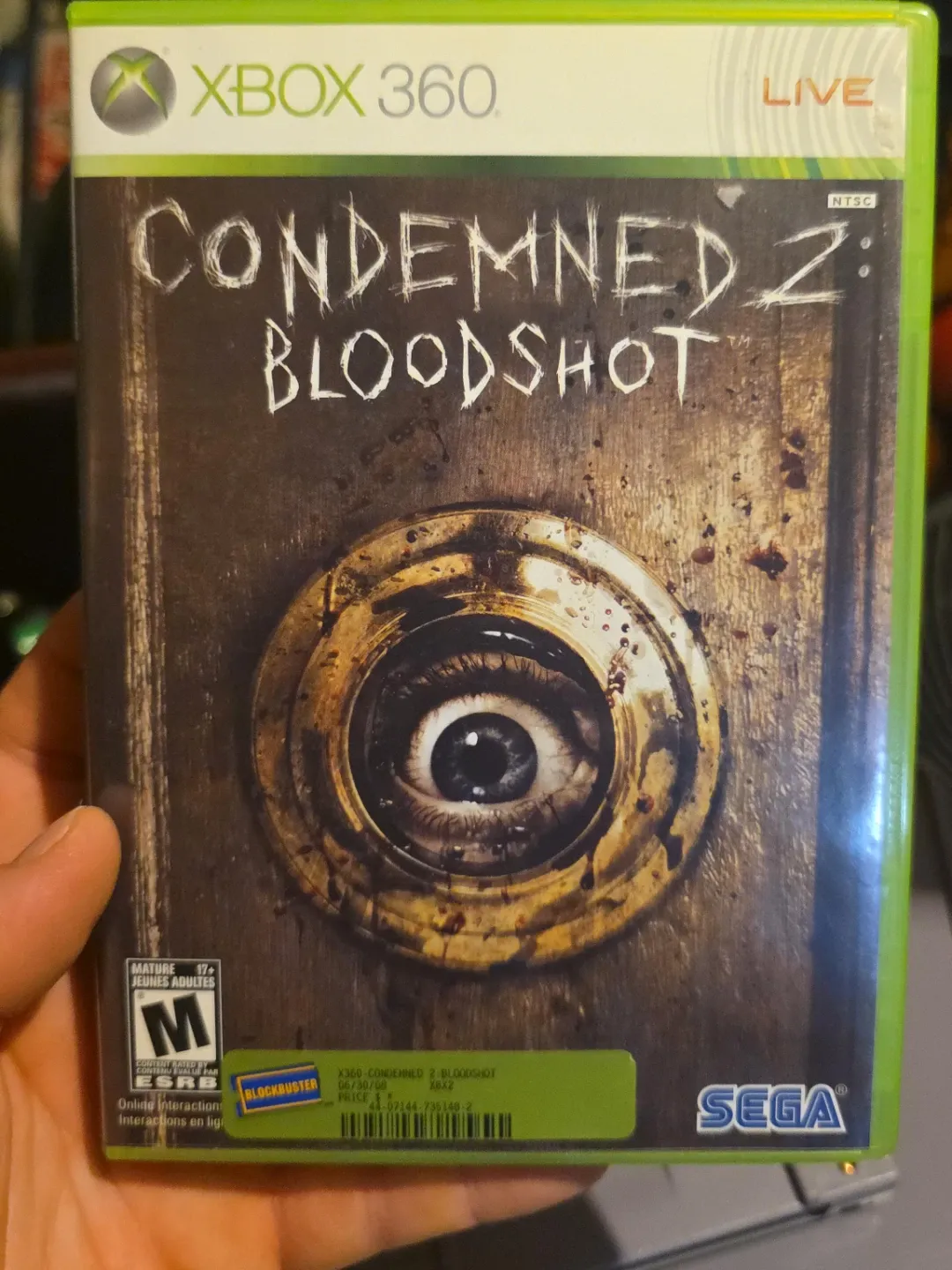 Selling a copy of Condemned 2: Bloodshot for the Xbox 360. Rated M for Mature. It's an NTSC version. The game was originally priced at $4 according to the Blockbuster sticker.