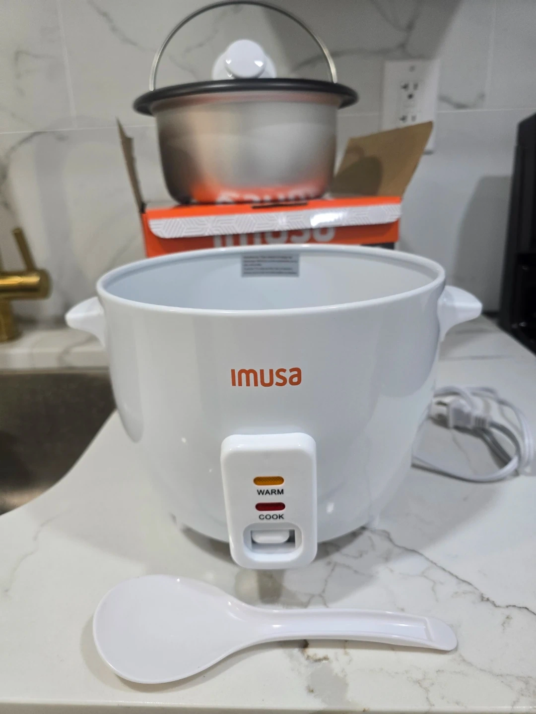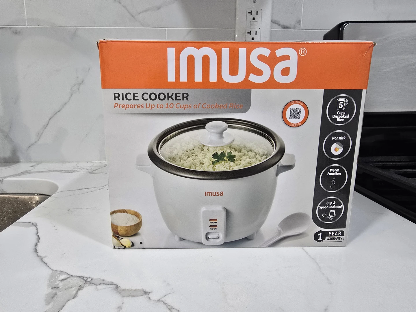 I'm selling an Imusa rice cooker that prepares up to 10 cups of cooked rice. It's nonstick and features a warm function. A spoon and a measuring cup is included! It also comes with the original box.