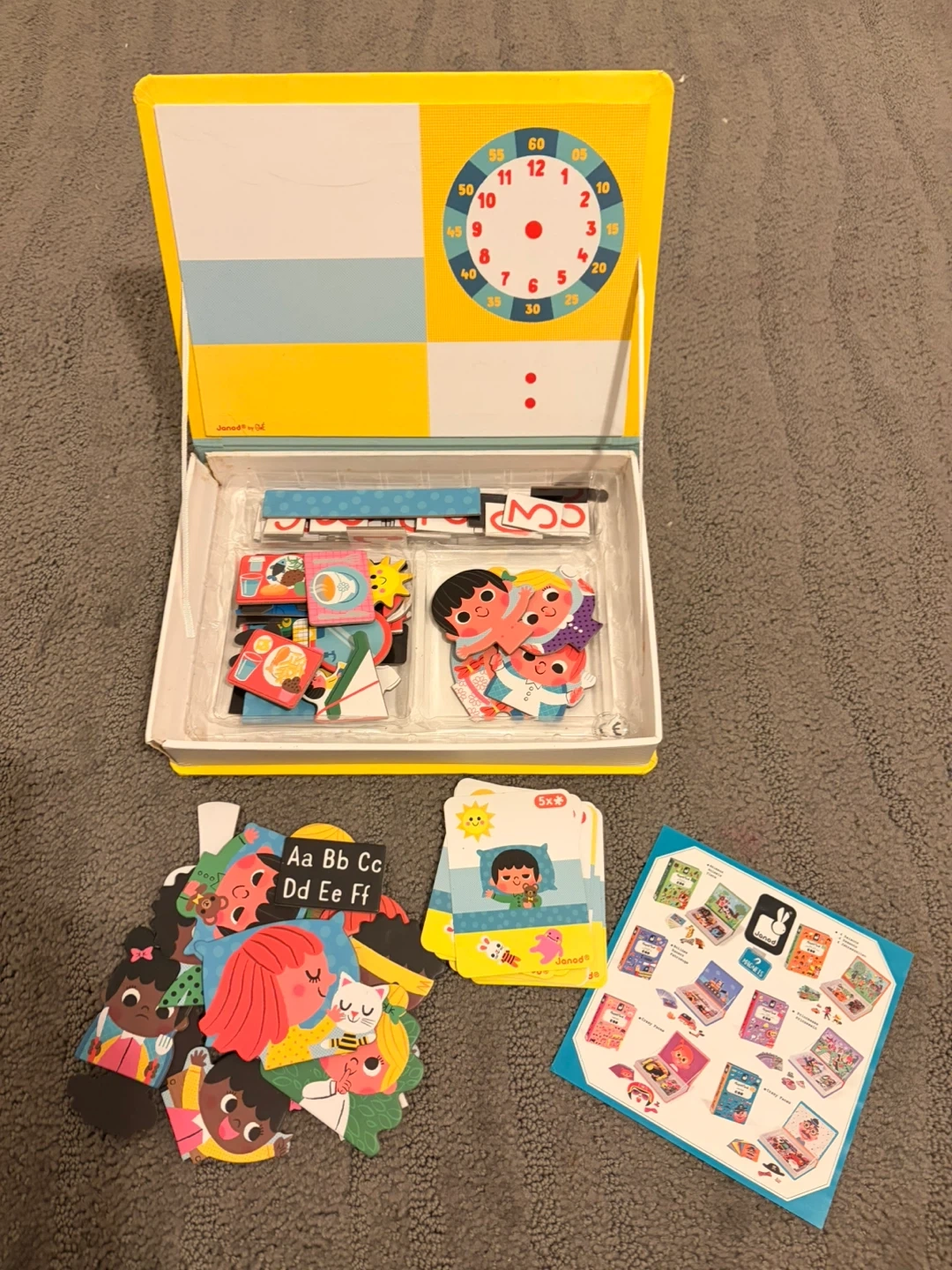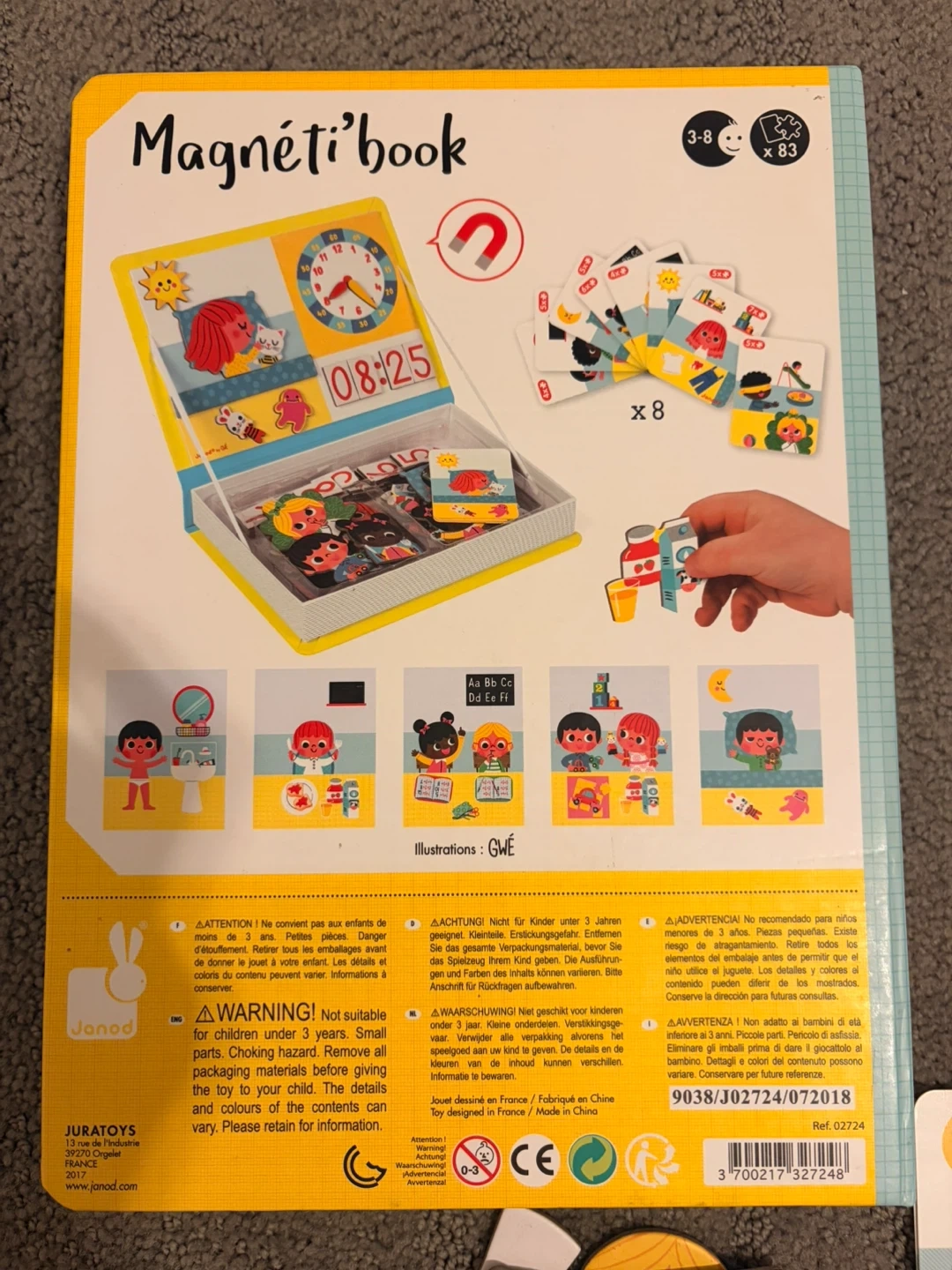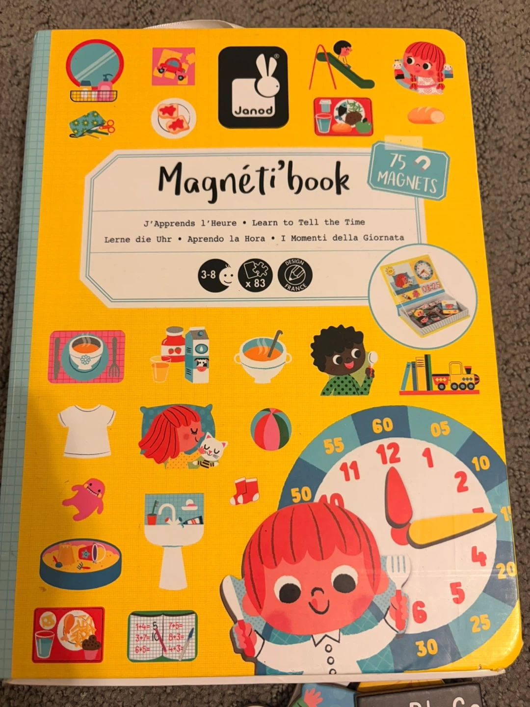 This Janod Magneti'book is a fun way for kids to learn to tell time! It comes with 75 magnets and cards to help children learn about telling time. Recommended for ages 3-8, it's a great educational toy that's also lots of fun