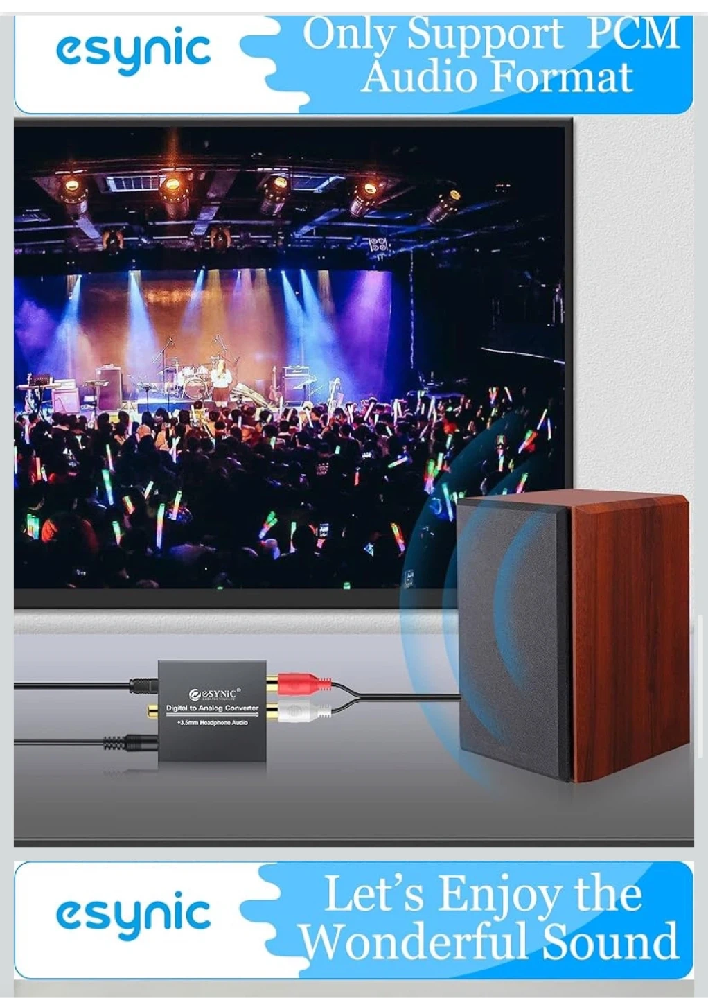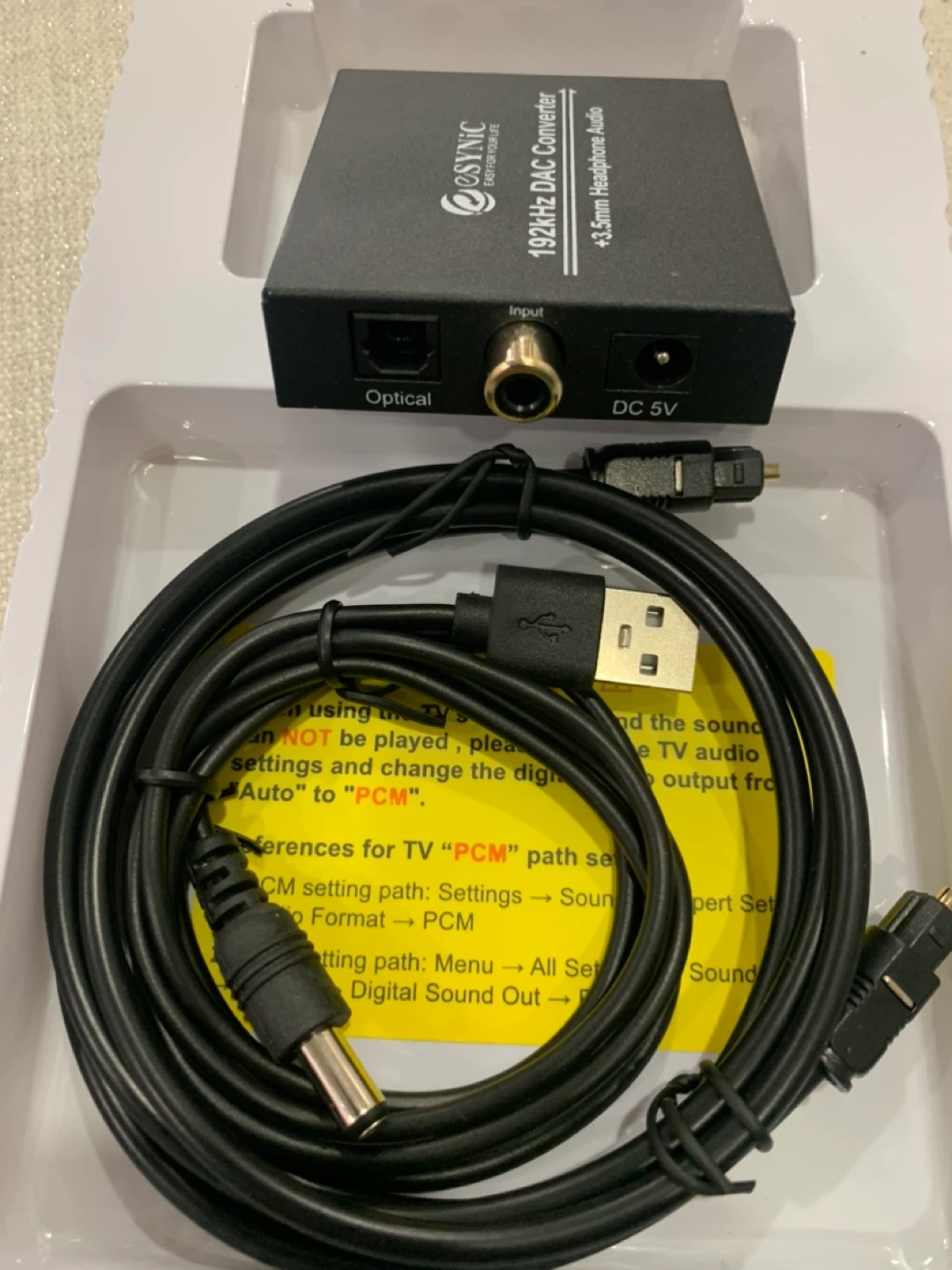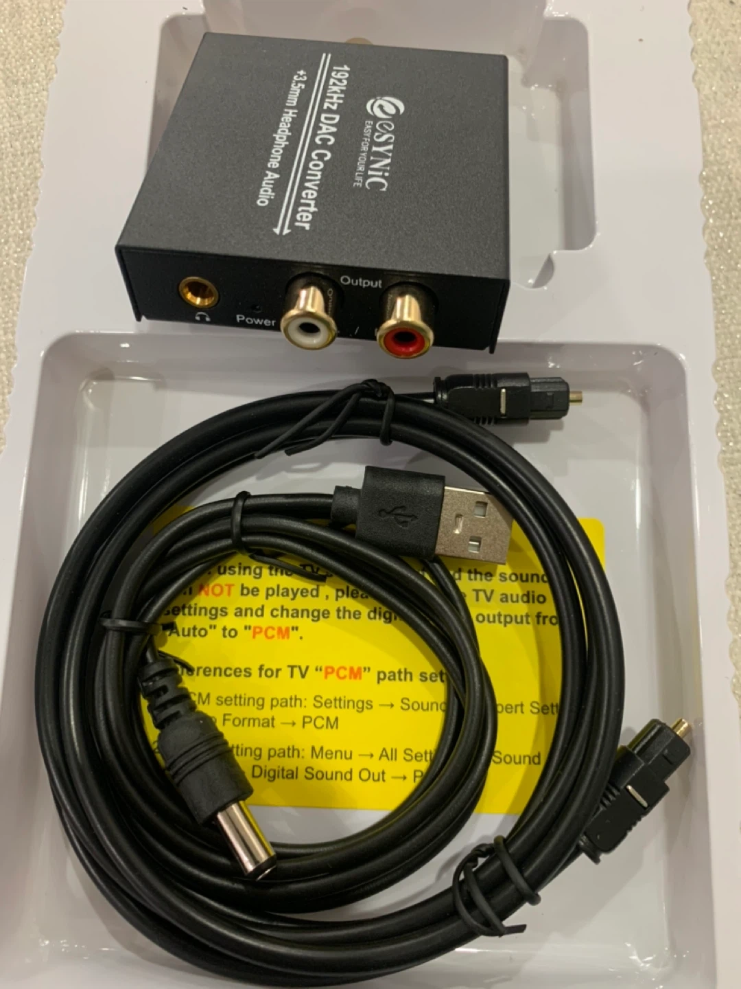 Selling an eSynic digital to analog audio converter. It supports 192kHz 24bit audio sample rates and uses the latest noise reduction technology. It supports RCA and 3.5mm output and only supports PCM audio format. Please set the audio output to PCM before using.