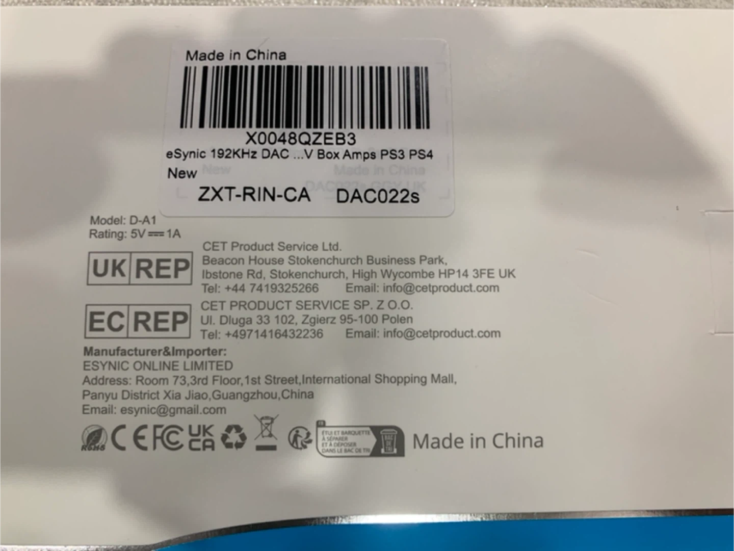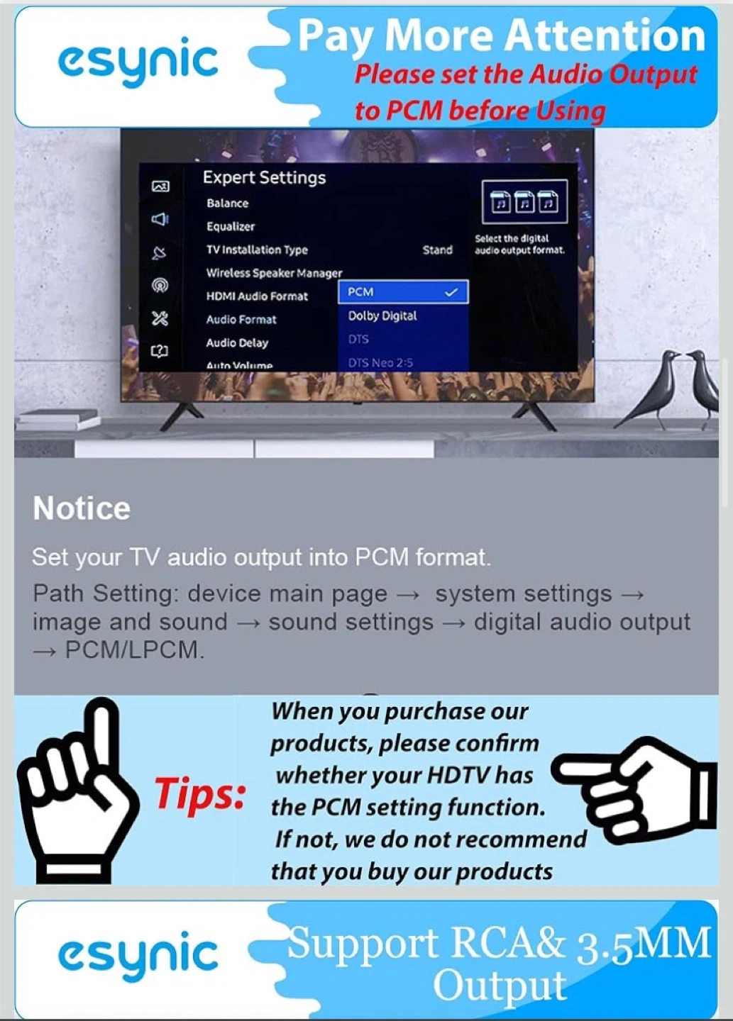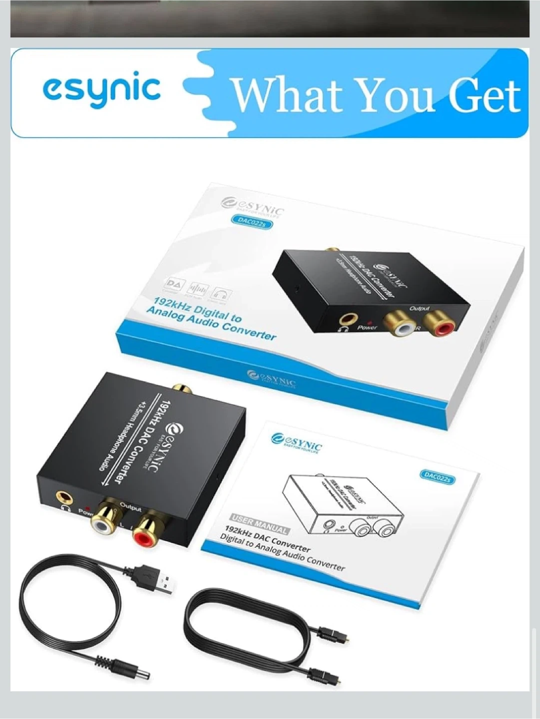 Selling an eSynic digital to analog audio converter. It supports 192kHz 24bit audio sample rates and uses the latest noise reduction technology. It supports RCA and 3.5mm output and only supports PCM audio format. Please set the audio output to PCM before using.