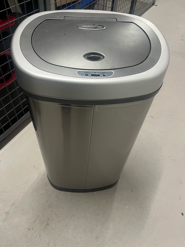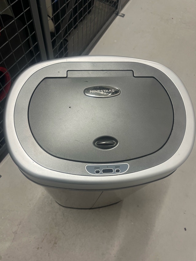 Good for: Home, office, or someone who wants an automatic trash can at a lower price and doesn’t mind a small fix. This is a used NineStars motion sensor trash can with a stainless steel finish. The lid opens automatically when motion is detected, offering a hands-free and hygienic way to dispose of waste. The trash can is in good working condition and has some minor cosmetic wear.