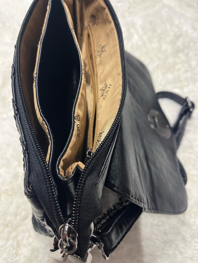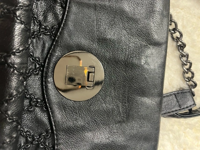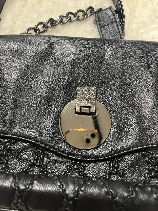 I'm selling a stylish black crossbody bag that's perfect for adding a touch of elegance to any outfit. This used bag features a quilted design, a chain strap, and a secure clasp closure and is in good condition, with only minor signs of wear. Additional features include: * Adjustable chain strap * Interior pockets * Quilted detailing. I'm pricing it at $30. If you're seeing this ad, the bag is still available!