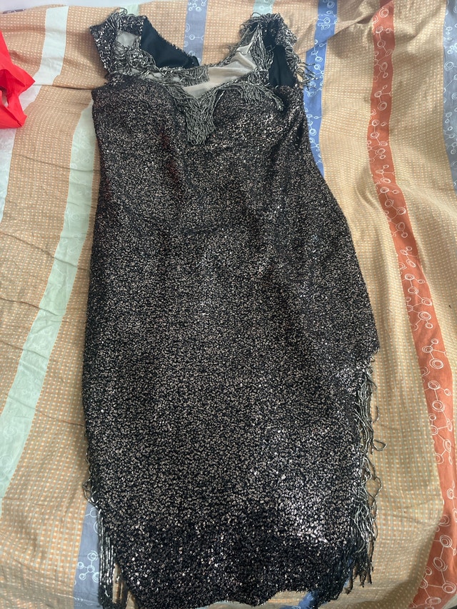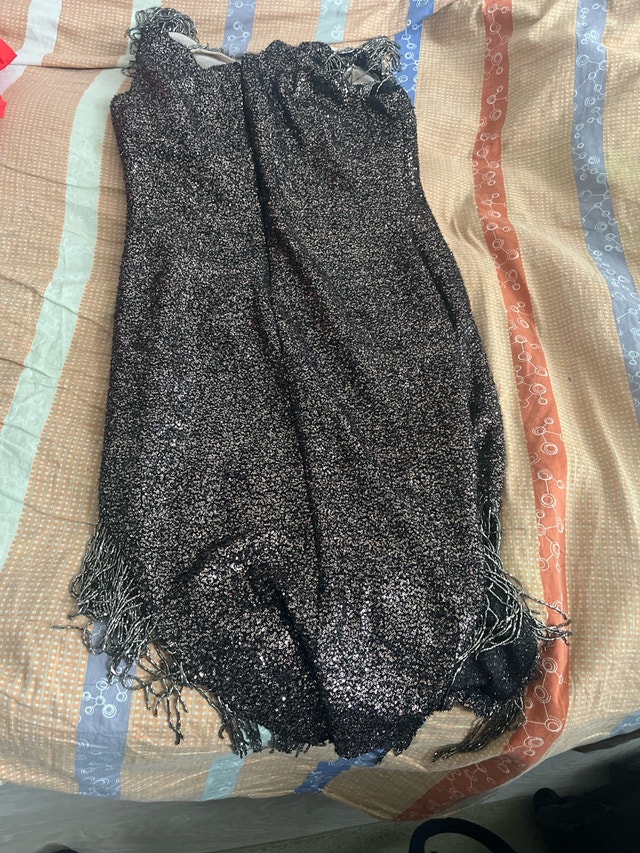 Add a little sparkle to your night with this fun fringe dress. This slinky number is in good condition, ready to turn heads and light up the dance floor. It's perfect for parties, nights out, or any occasion where you want to shine. The sparkly detail catches the light beautifully, making you the centre of attention. Size: Medium