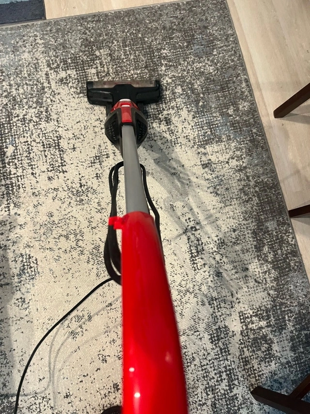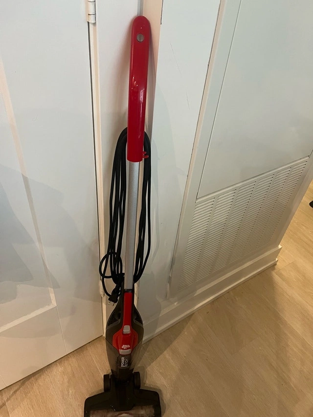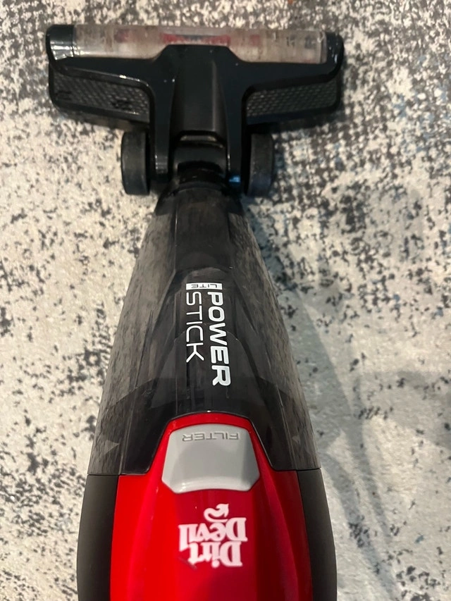 This Dirt Devil Power Stick Lite is a lightweight and versatile corded bagless stick vacuum cleaner, perfect for quick clean-ups on hard floors and carpets. It features a motorized brushroll and a removable hand vacuum for added convenience. This vacuum has been used, but still has plenty of life left for keeping your home tidy!