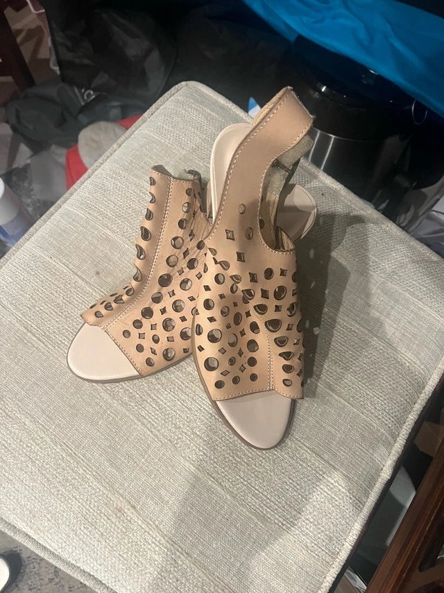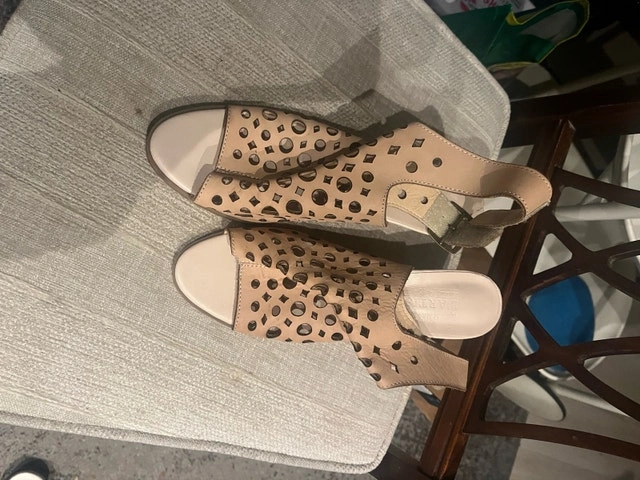 Step out in style with these L'Artiste beige genuine leather sandals in size 38, featuring a unique laser-cut design. These sandals are in good condition, as you can see, they've been gently worn. Here are some additional details:
