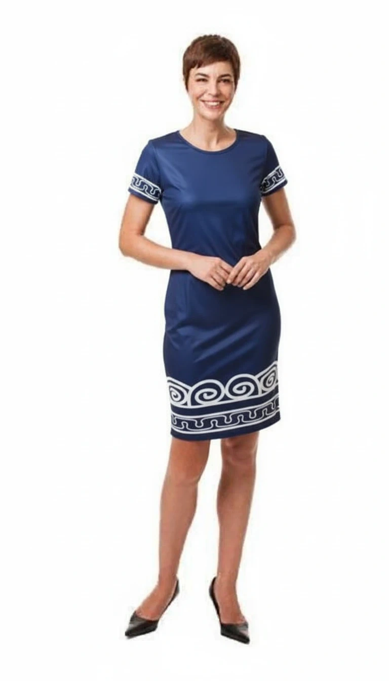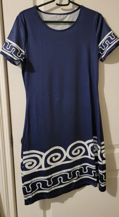 A cute blue dress with a unique white pattern! It's in great condition and would be a stylish addition to your wardrobe. The fabric is stretchable. Size small.