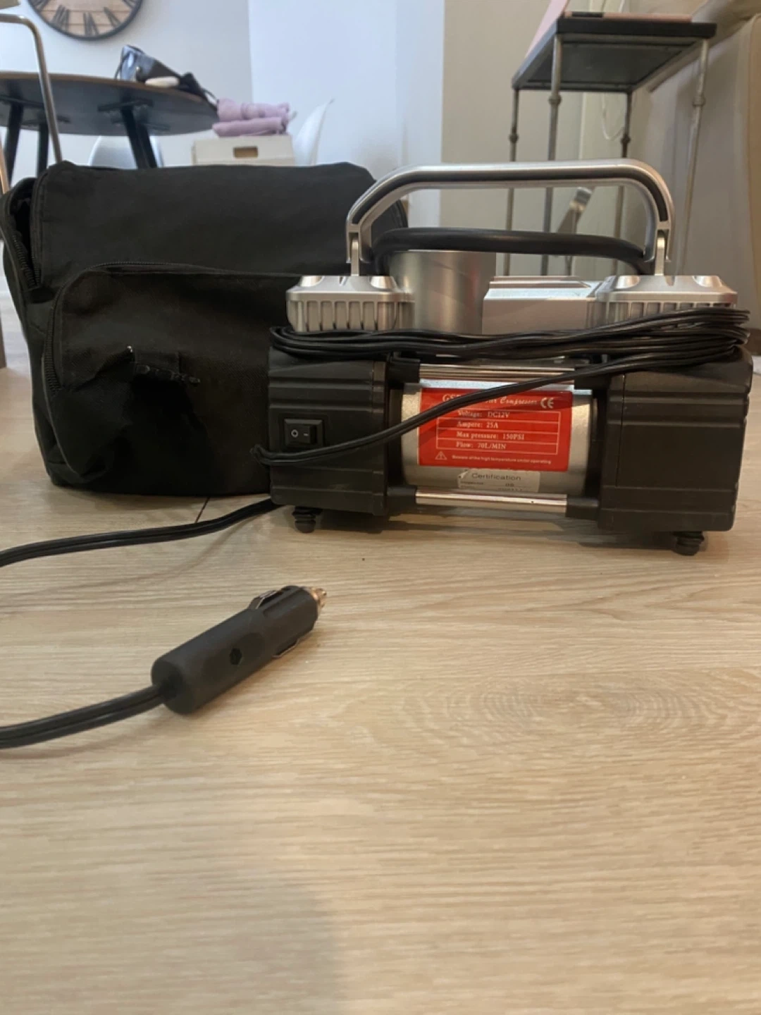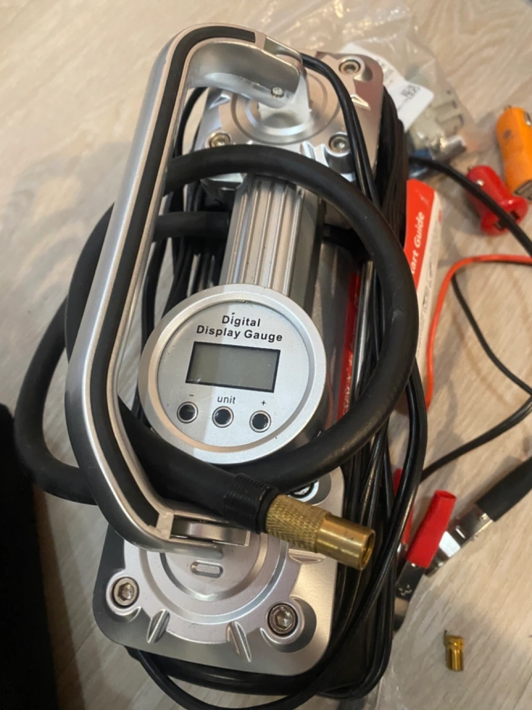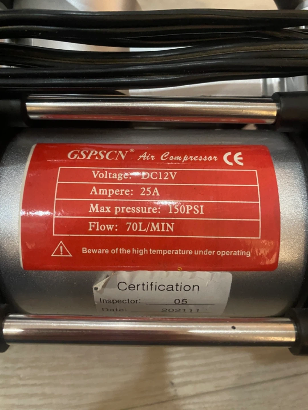 Selling a GSPSCN air compressor with a digital display. It runs on DC 12V and has a maximum pressure of 150 PSI.