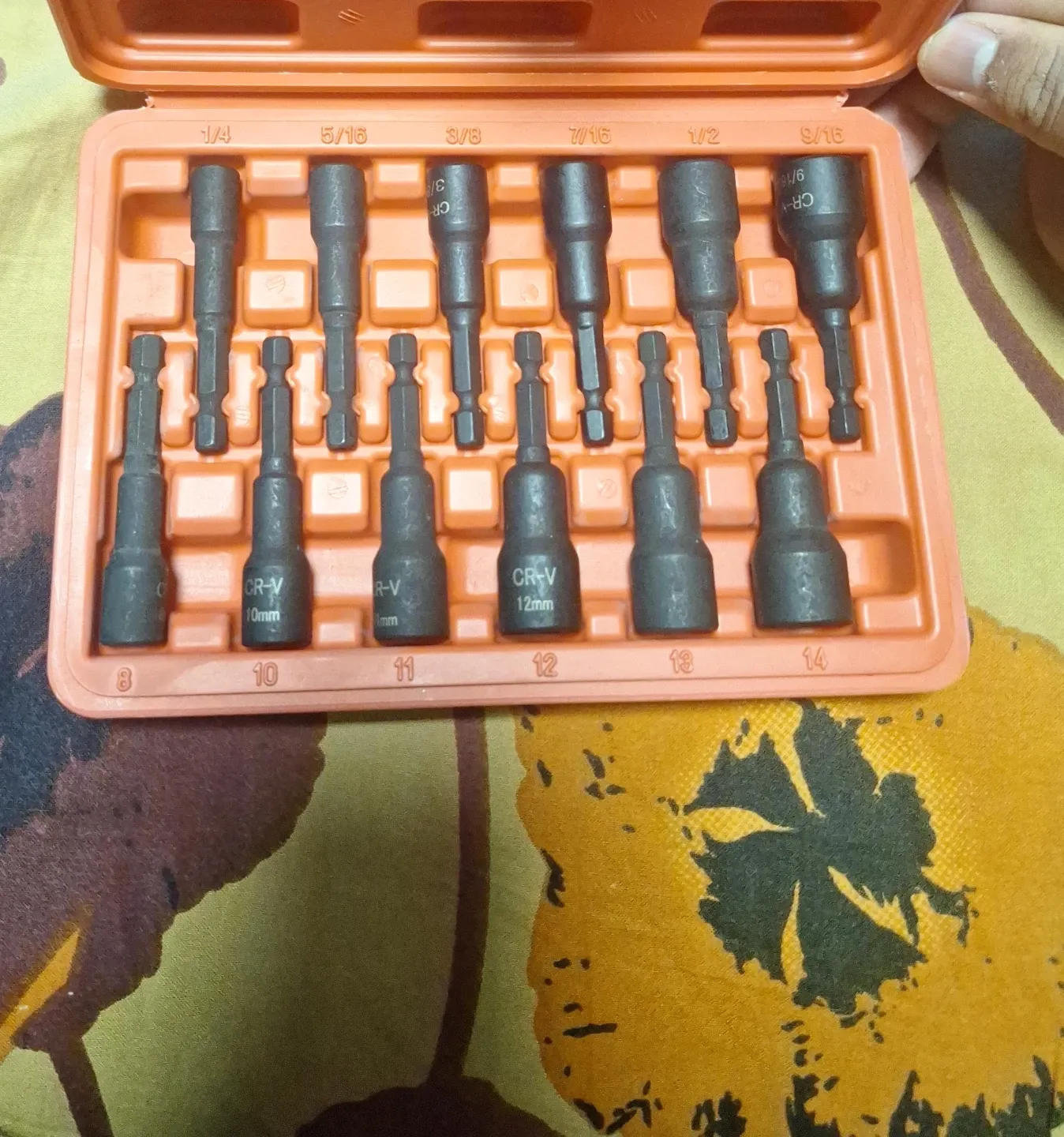 Here's a set of CR-V nut drivers. The sizes are clearly marked on the orange case: 1/4, 5/16, 3/8, 7/16, 1/2, 9/16, and also 8mm, 10mm, 11mm, 12mm, 13mm, 14mm