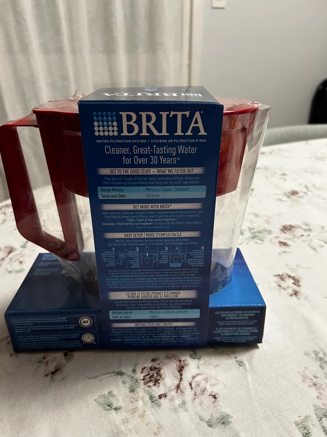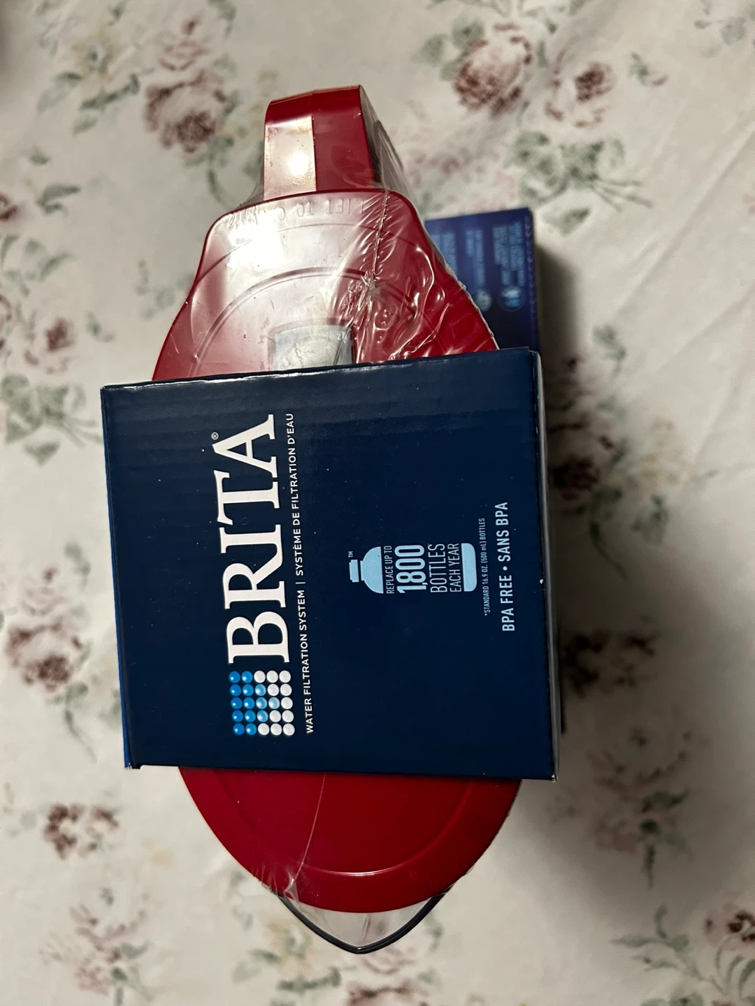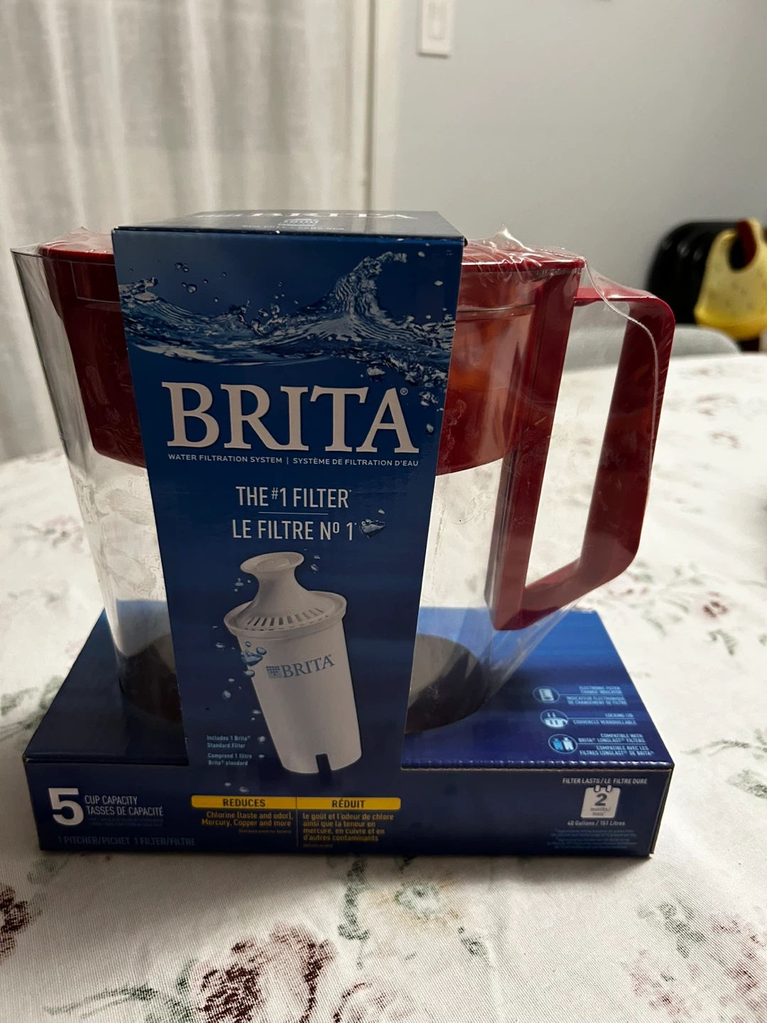 Red and brand new Brita water filter pitcher, still in its original packaging! It has a 5 cup capacity. This Brita Soho Pitcher is perfect for cleaner, It reduces heavy metals like mercury and copper, as well as chlorine, improving taste and odour. Get yours today!