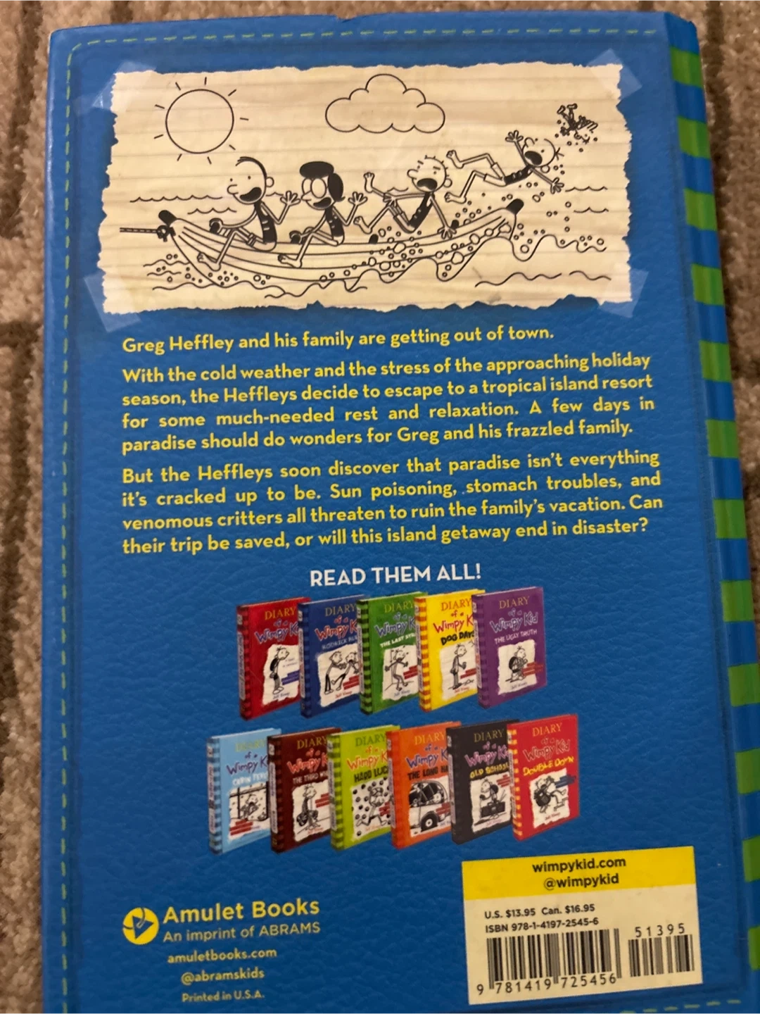 Selling Diary of a Wimpy Kid: The Getaway, book 12 in the series! It's written by Jeff Kinney and published by Amulet Books. The story follows Greg Heffley and his family as they try to escape to a tropical island resort. Originally $13.99 USD.