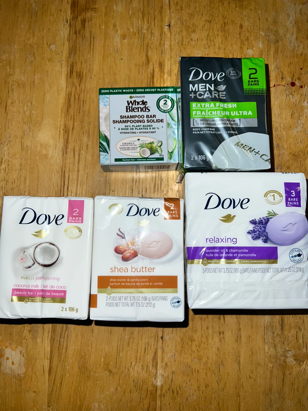 Selling a bundle of Dove soap bars and a Garnier Whole Blends shampoo bar. Includes: