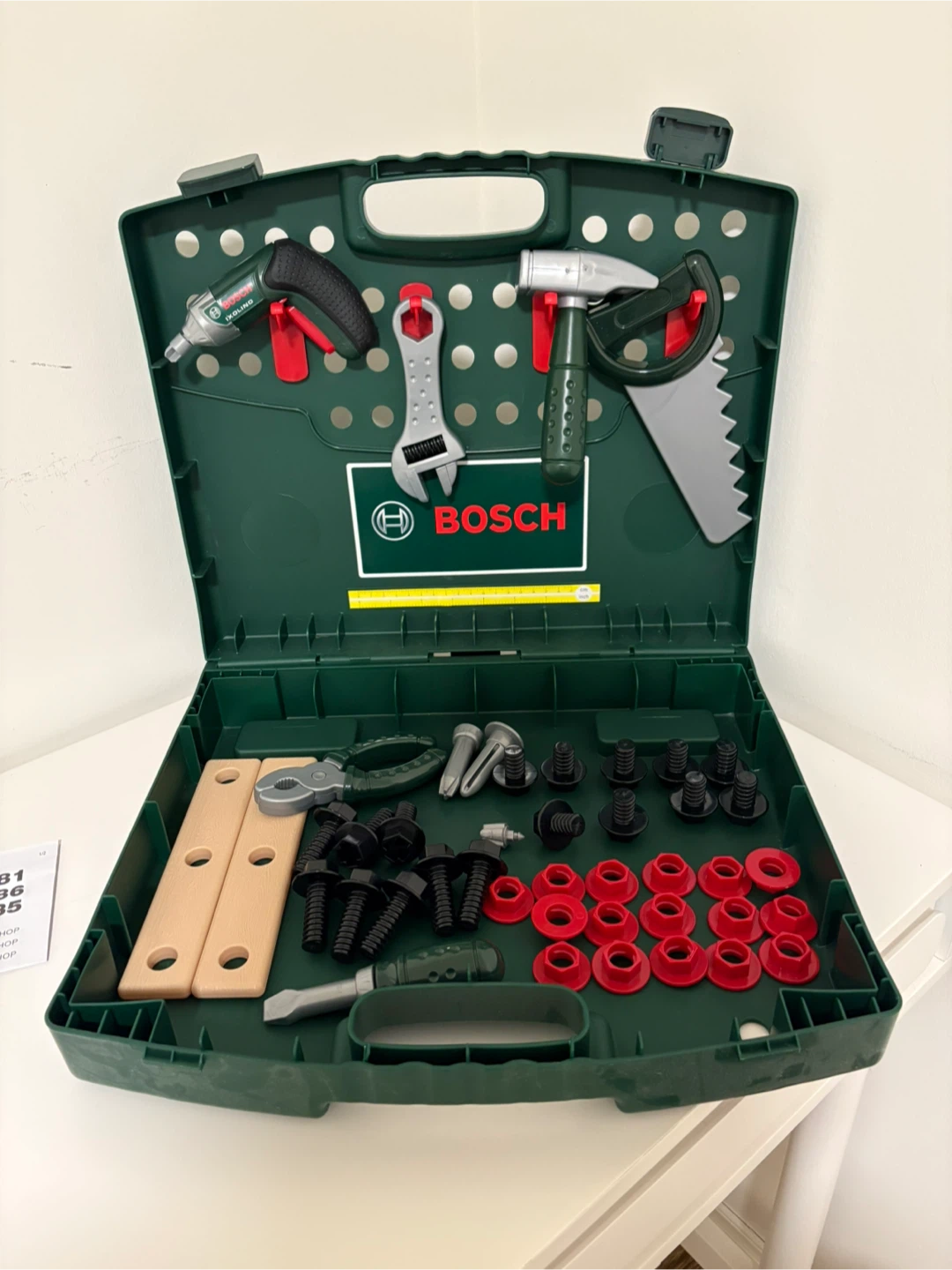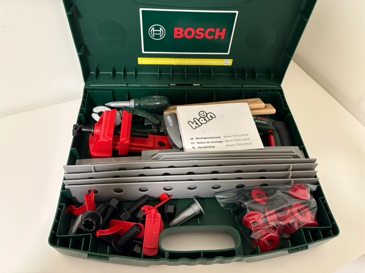 Selling a Bosch Klein toy tool set. It's a great set for kids who love to build and fix things! Includes various tools and accessories. Some parts are missing.