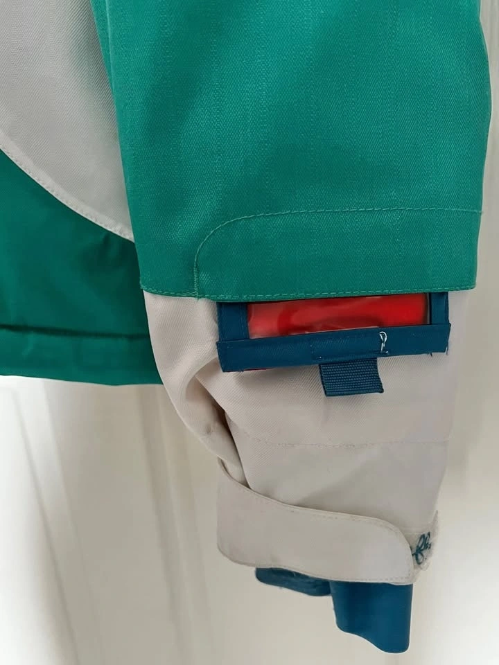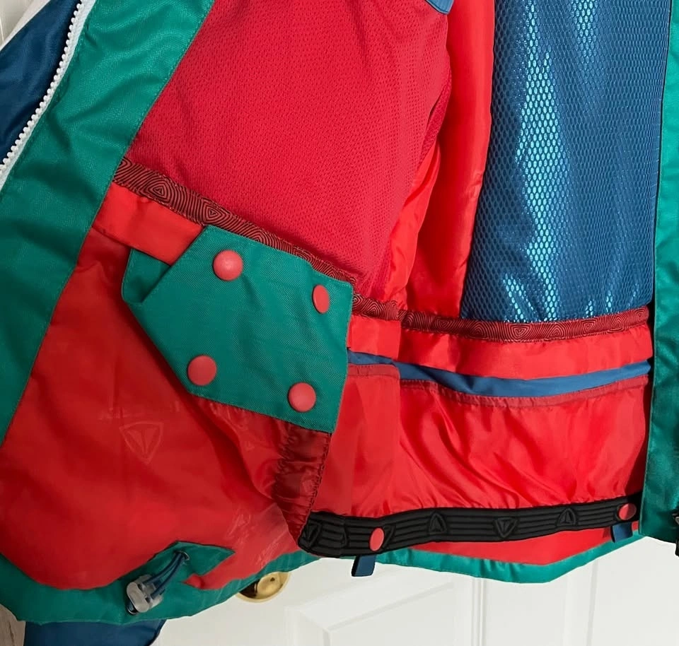 Woman's Ski Jacket fits Large. Has lost of pockets, and a detatchable hood. Sleeve is 19.5" from underarm. Other measurement in picture selection. Additional $35 for ski pants when purchased together with jacket.