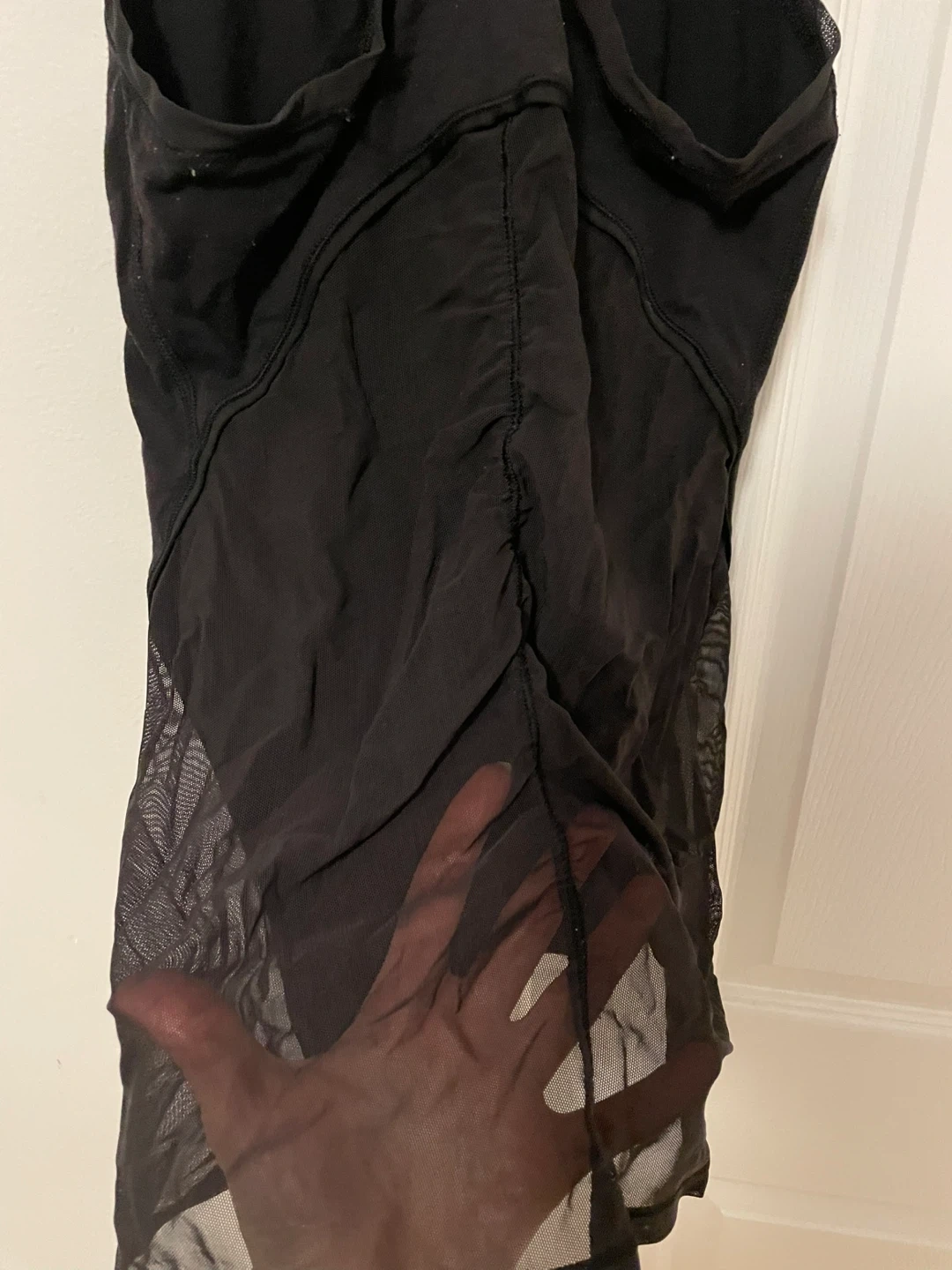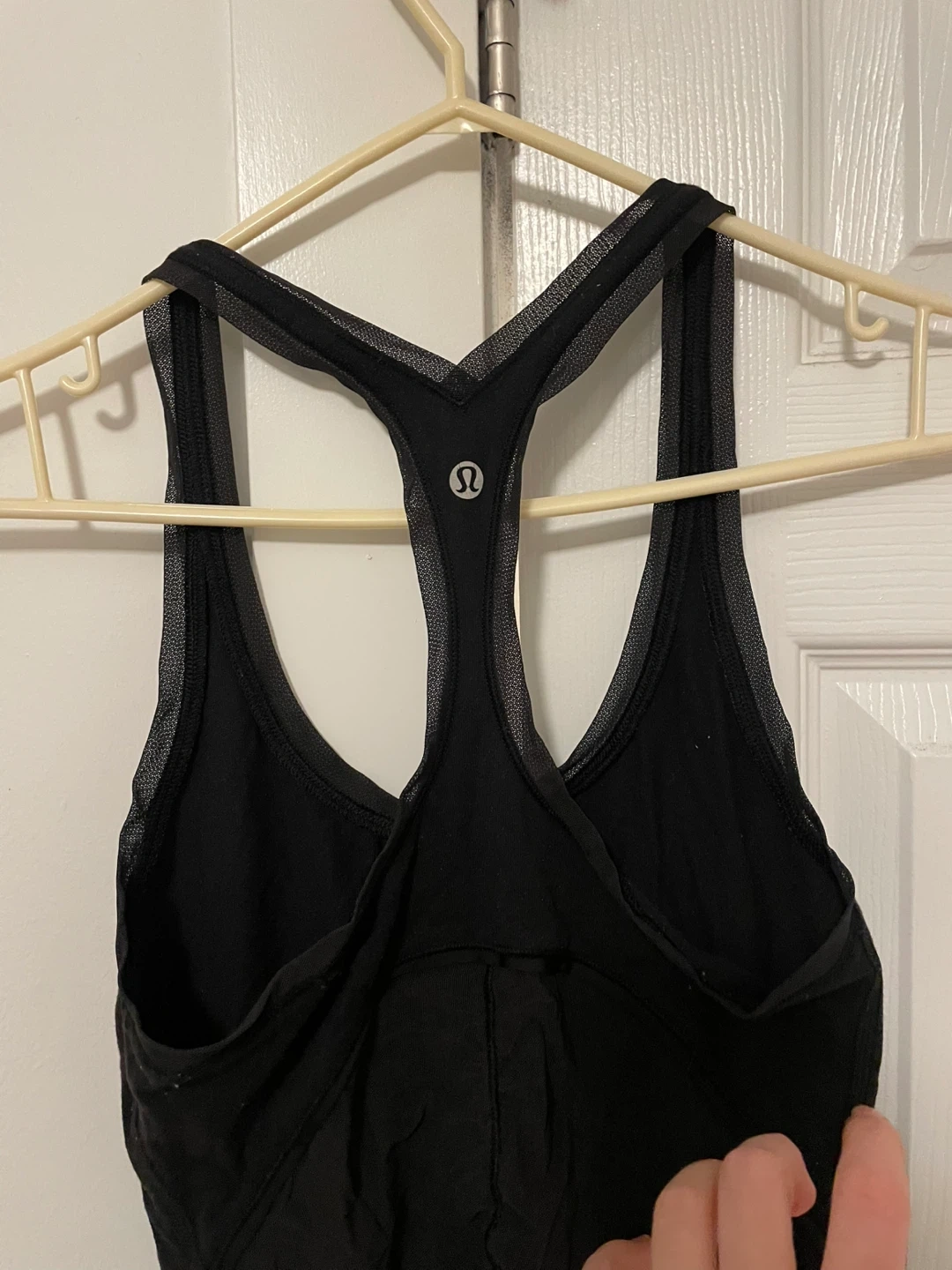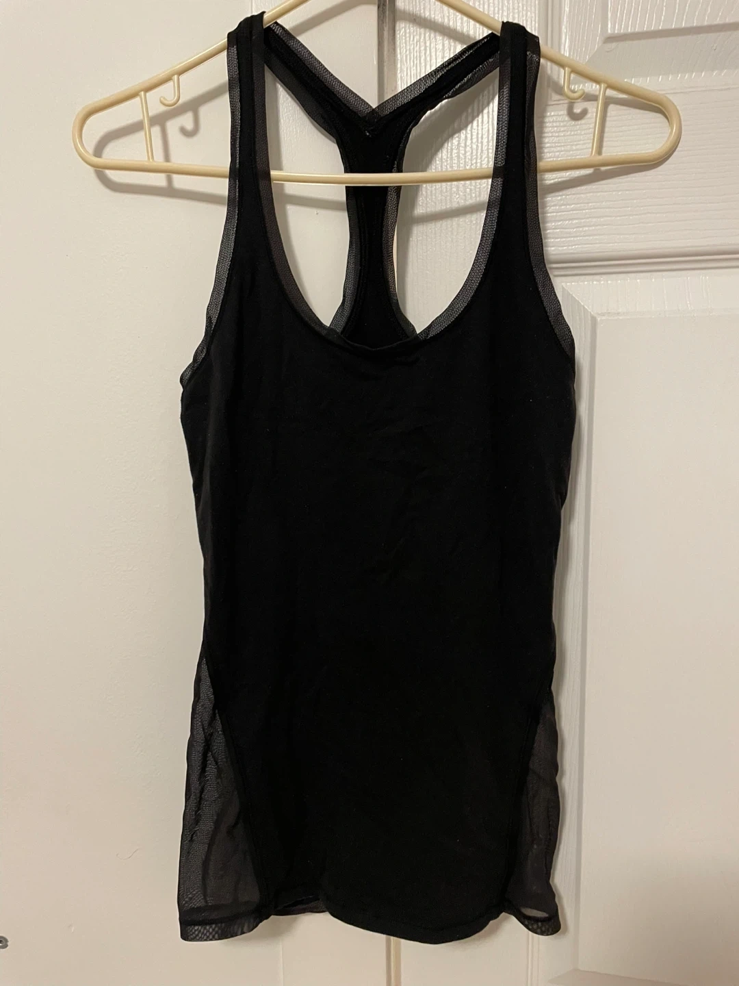 Selling a Lululemon racer back tank top in black, with a mesh detail along the back of the top. Size tag is missing but this is an 8.