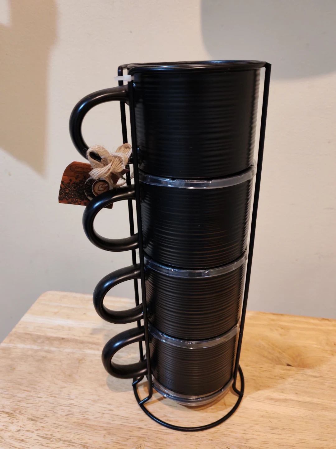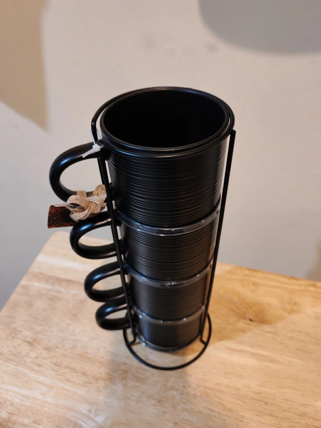 Keep your mugs organized with this sleek black mug stack and stand! It holds up to four mugs, saving space in your kitchen. The stand is sturdy and the mugs are easy to access. Perfect for coffee or tea lovers!