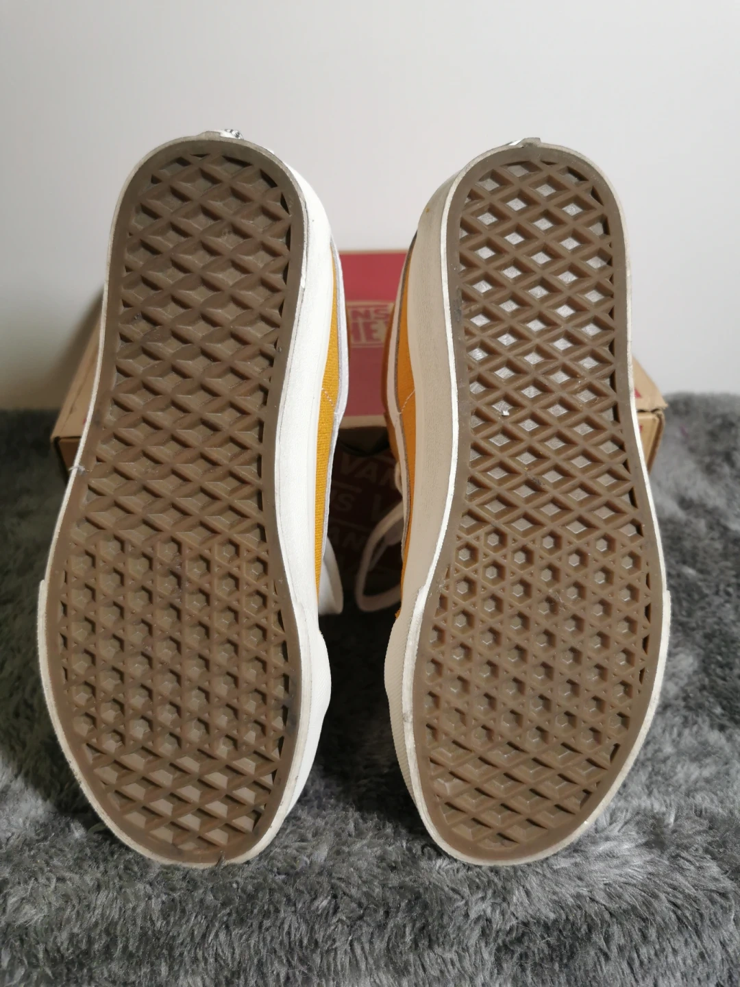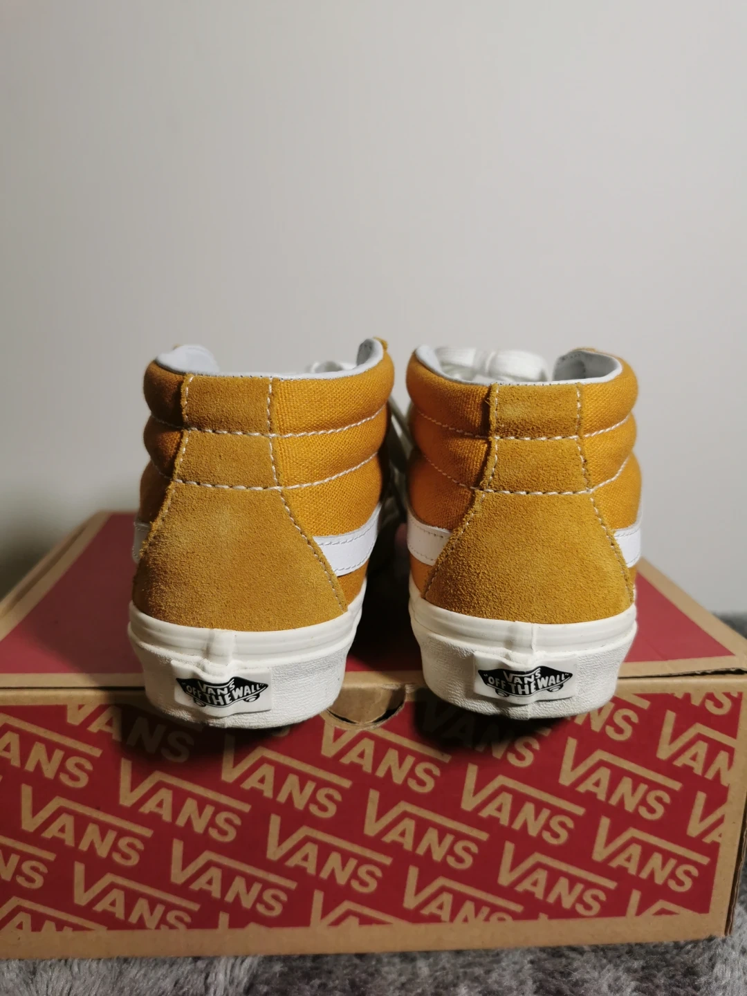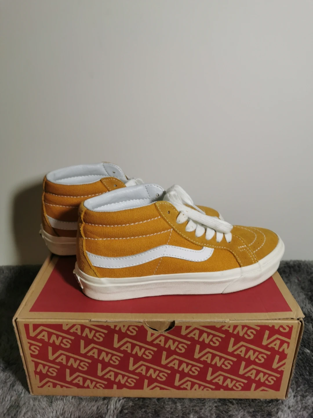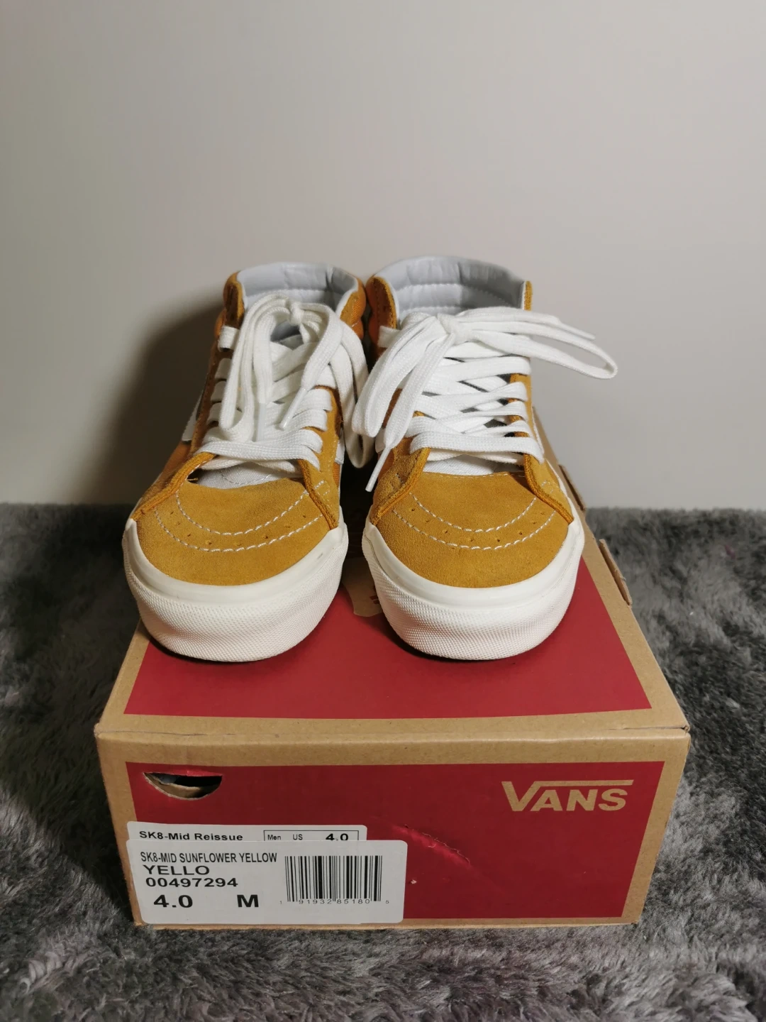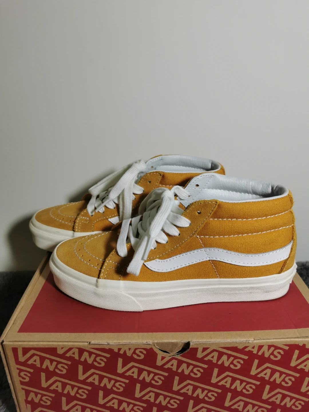 Selling a pair of Vans Sk8-Mid Reissue in Sunflower Yellow, size US 4.0 (M). The shoes come with the original box