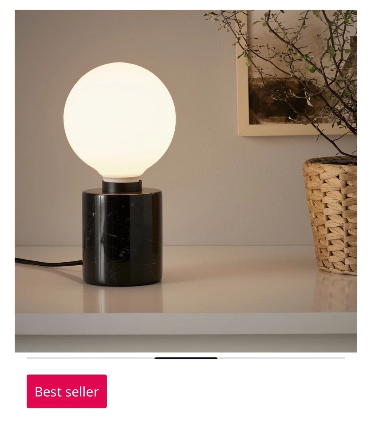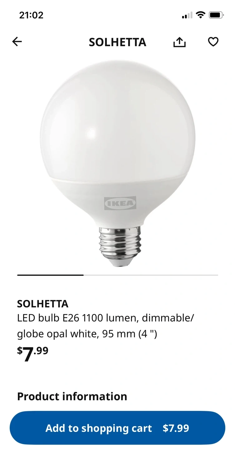 Selling a like-new IKEA Solhetta LED bulb. It's an E26 base, 1100 lumen, dimmable globe in opal white. It measures 95 mm (4 inches).