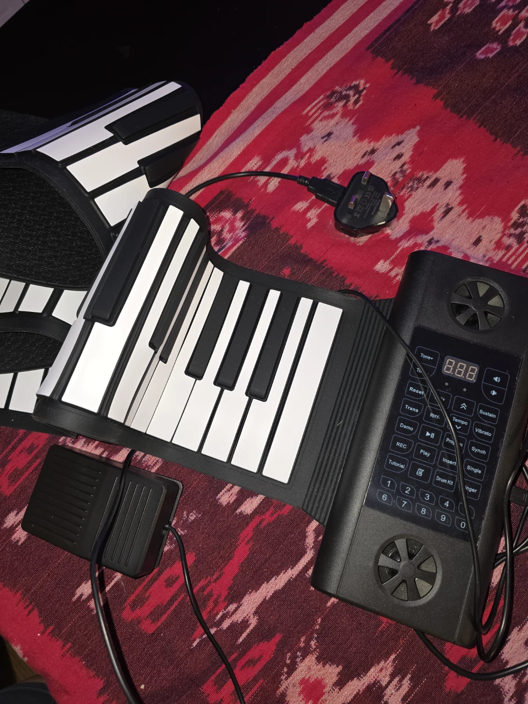 Selling a roll-up piano keyboard! It's super portable and easy to store. Great for beginners or anyone who wants a piano they can take anywhere. It includes a pedal and power supply (UK plug) no box.