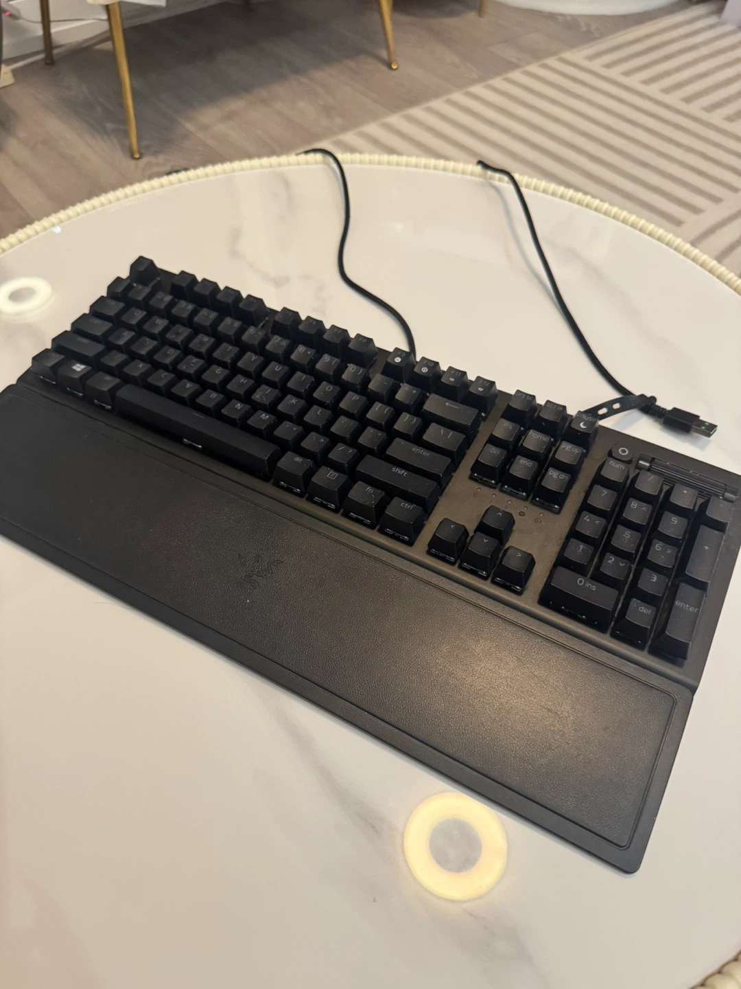 Selling a Razer BlackWidow 3 Elite mechanical keyboard in good condition. It's a full-sized keyboard, perfect for gaming or work. It comes with a wrist rest for added comfort during long sessions. If you're looking for a reliable and responsive keyboard, this could be a great choice!