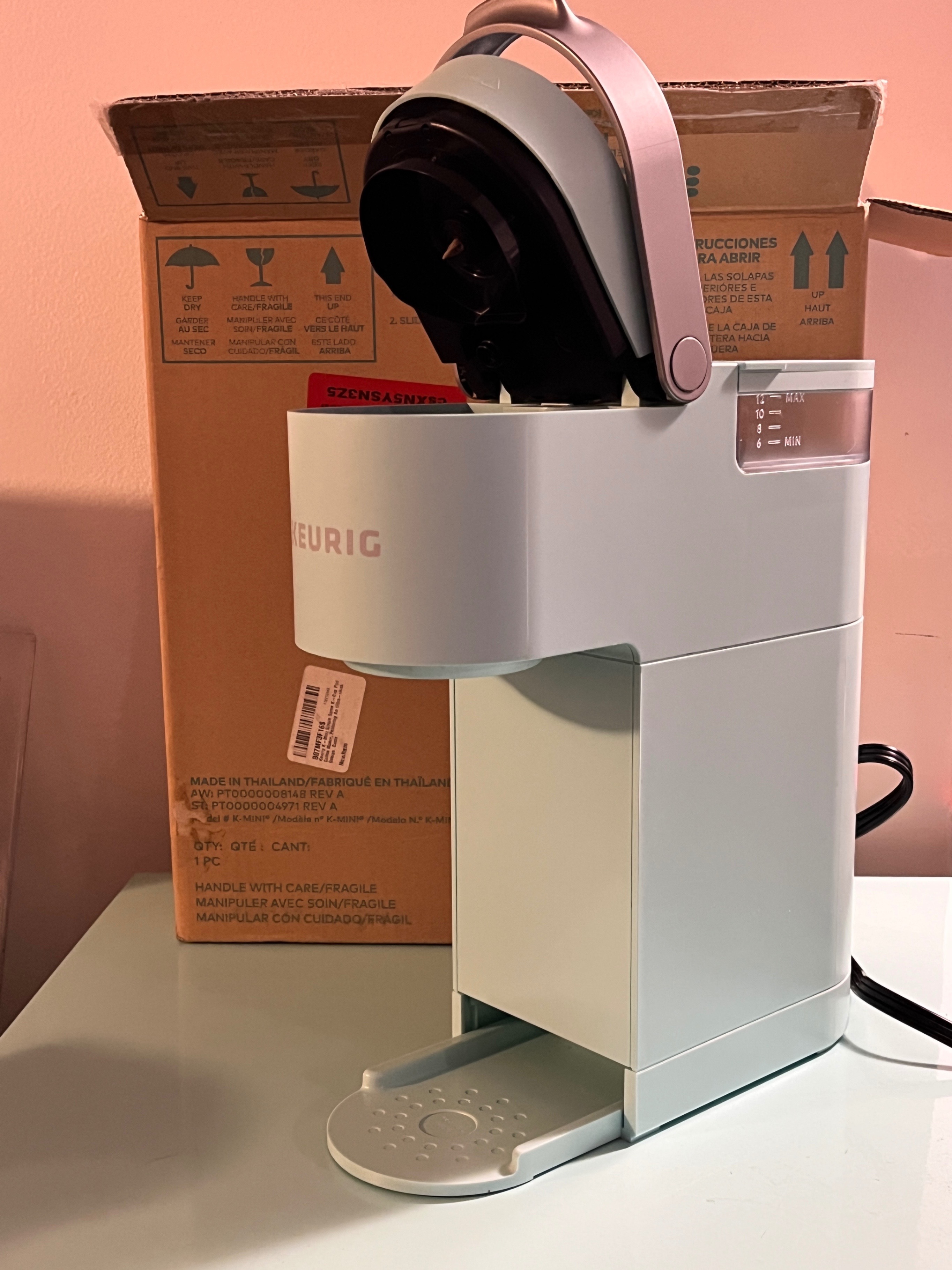 Selling a Keurig K-Mini single serve coffee maker in the Oasis colour! It's in great condition and comes with the original box. Perfect for a small space or just making a single cup of coffee in the morning