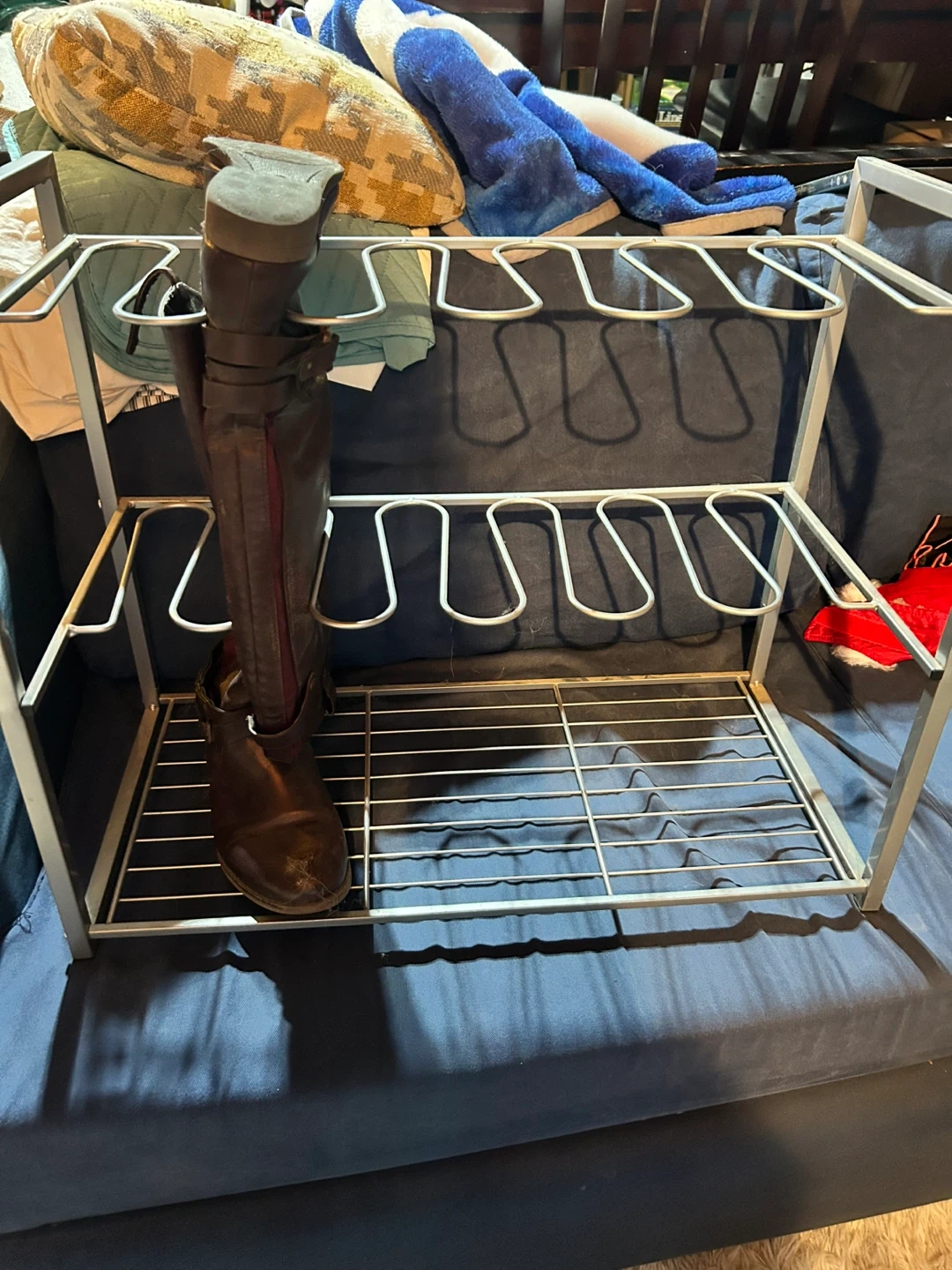 Here's a handy boot rack to keep your footwear organized! It's made of silver metal and has two tiers for storing multiple pairs of boots or shoes. Great for entryways or closets to keep things tidy