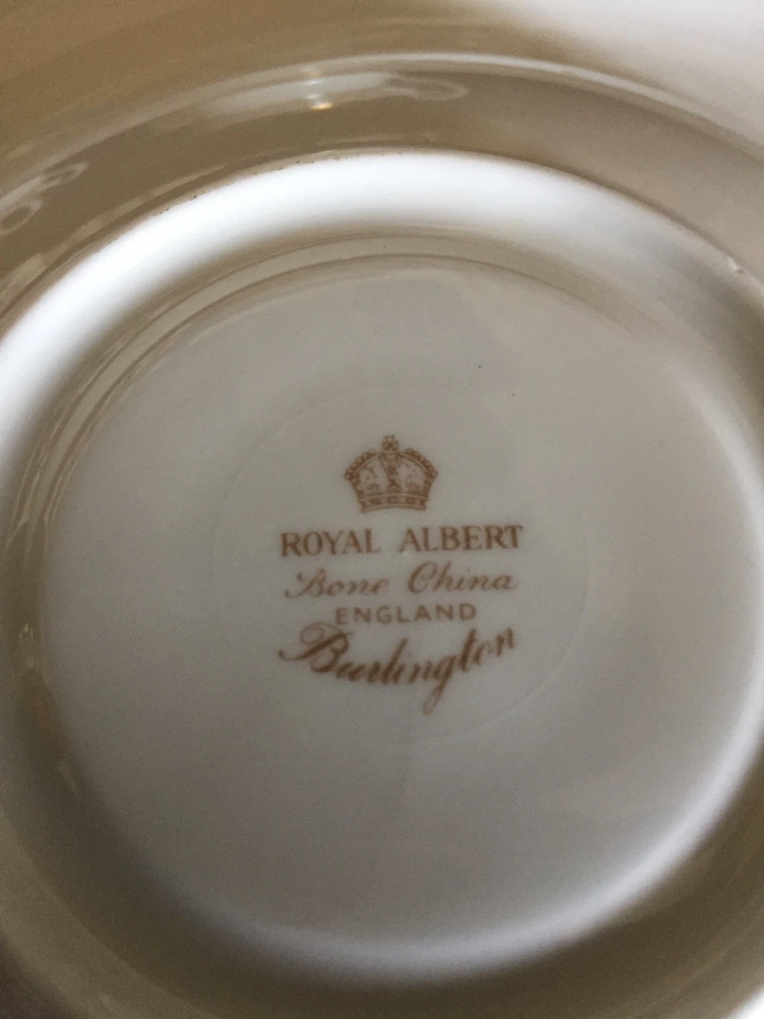 Selling a Royal Albert Bone China tea set in the Burlington pattern. This set includes cups, saucers, plates, a creamer, and a sugar bowl. It's a beautiful set for tea parties or display!