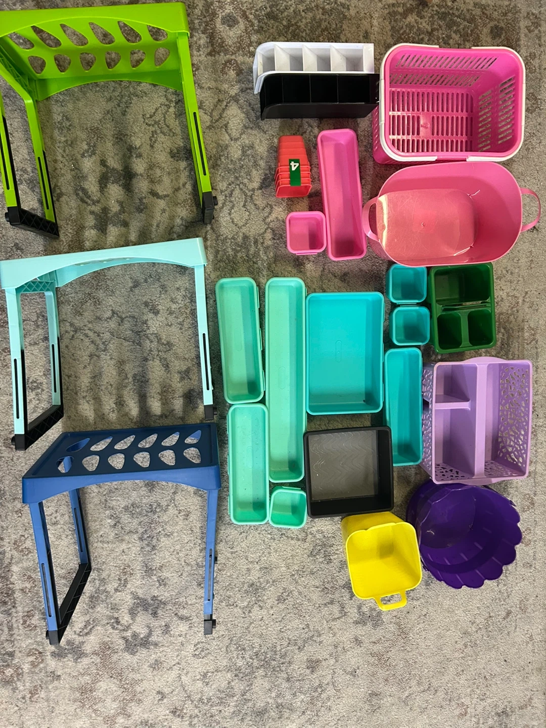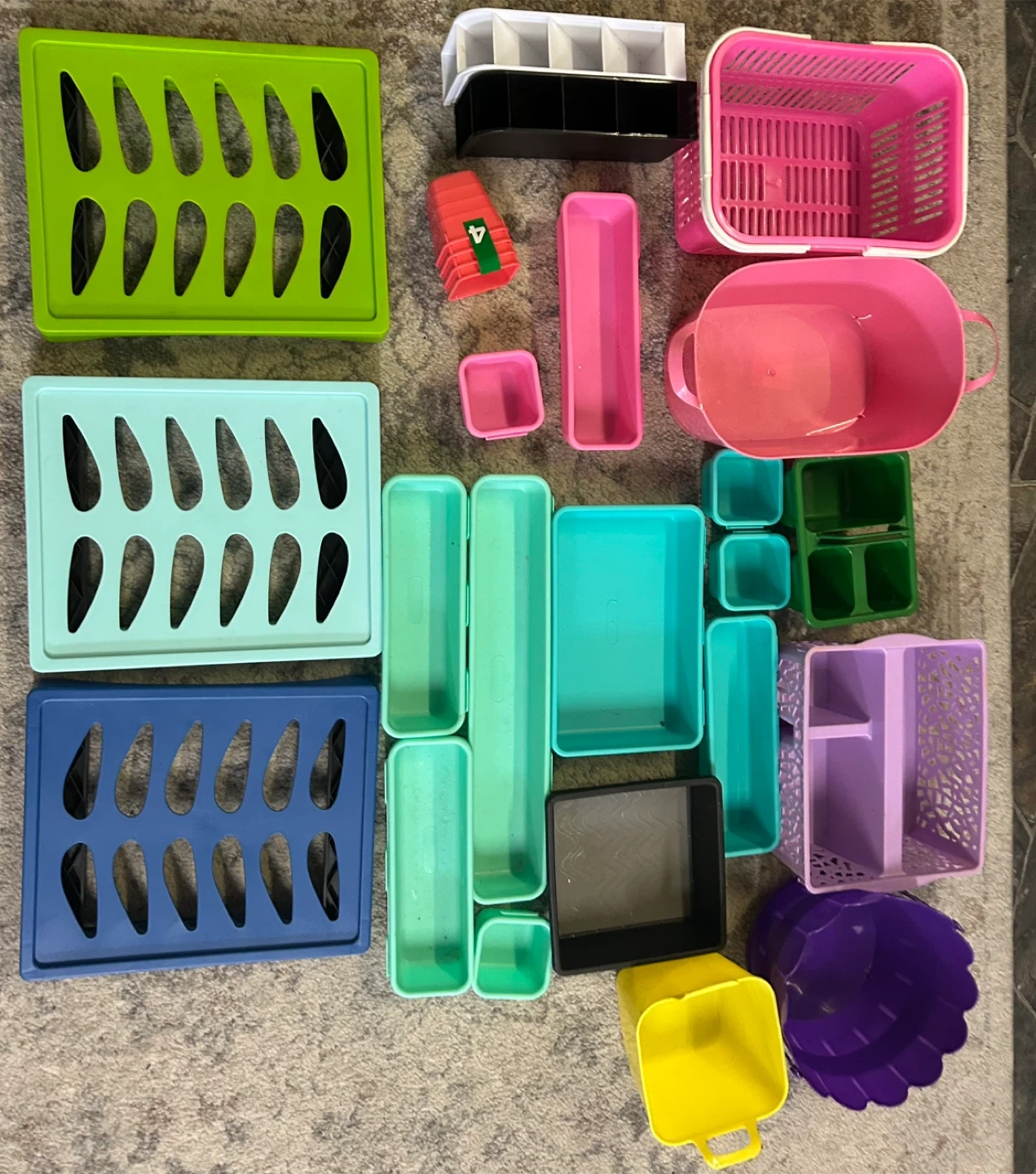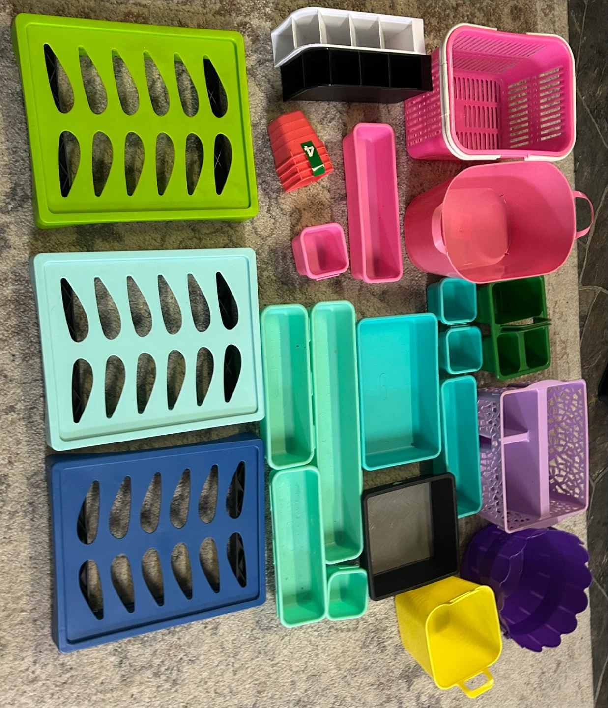 Selling a collection of assorted storage bins and organizers! There's a variety of shapes, sizes, and colours, perfect for tidying up any space in your home. Great for drawers, shelves, or countertops!