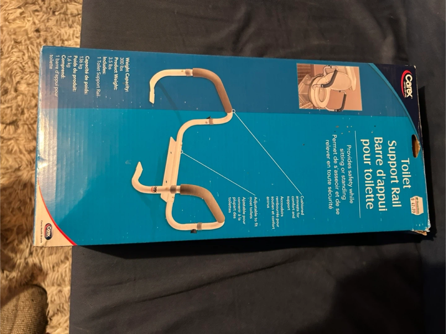 Selling a Carex Toilet Support Rail! It provides safety while sitting or standing and has cushioned armrests for comfort and support. It is adjustable to fit most toilets. Includes one toilet support rail. The weight capacity is 300 lbs and the product weight is 3.5 lbs
