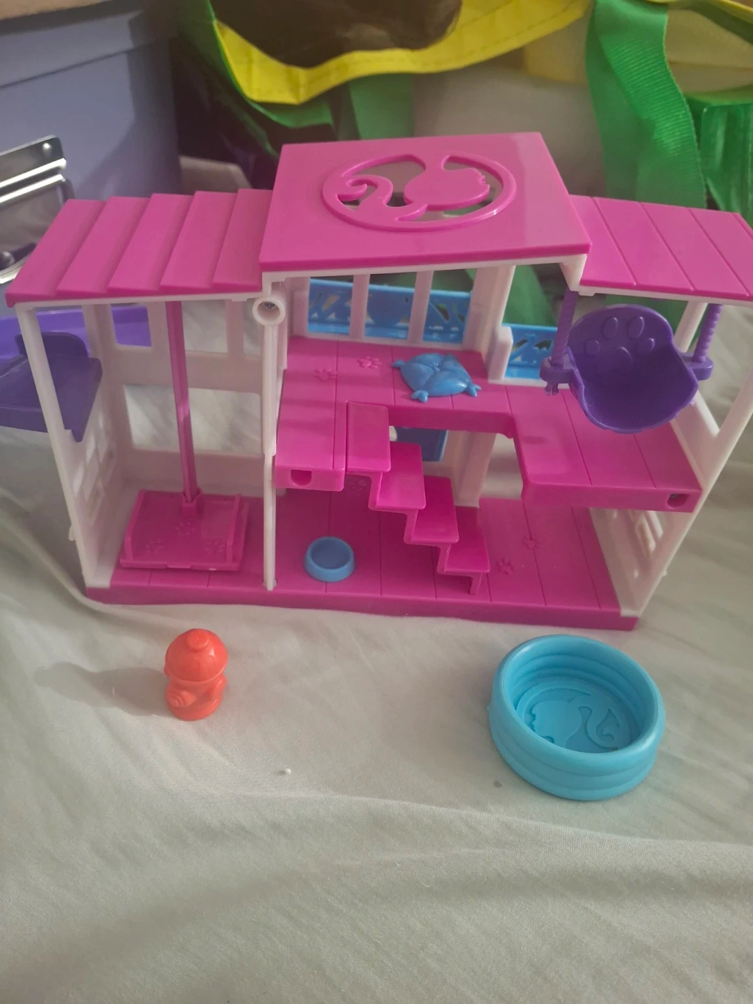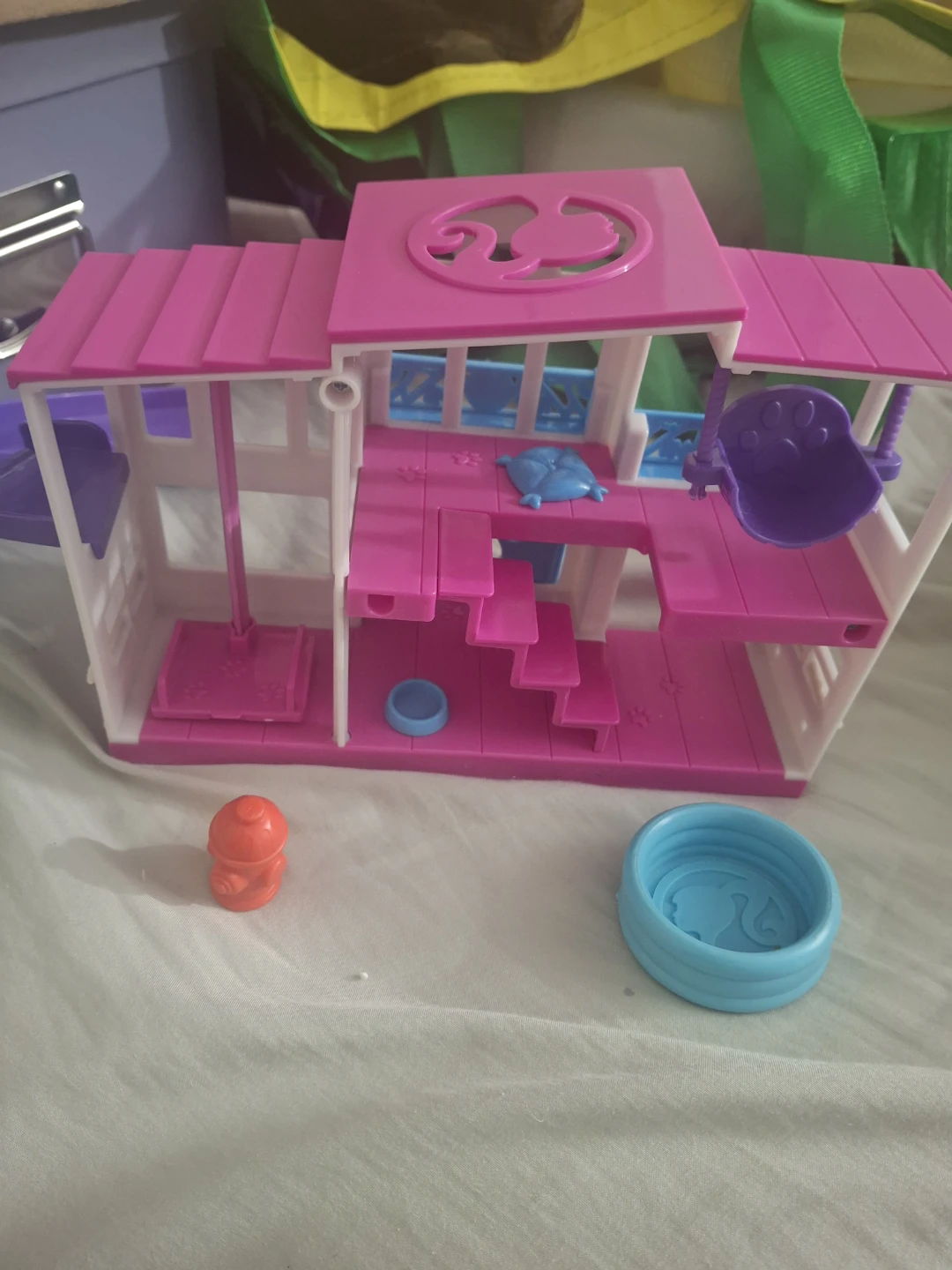 Selling a cute Barbie pet house playset! It comes with a little pool, a swing, and a tiny figure. Perfect for your little one's Barbie collection