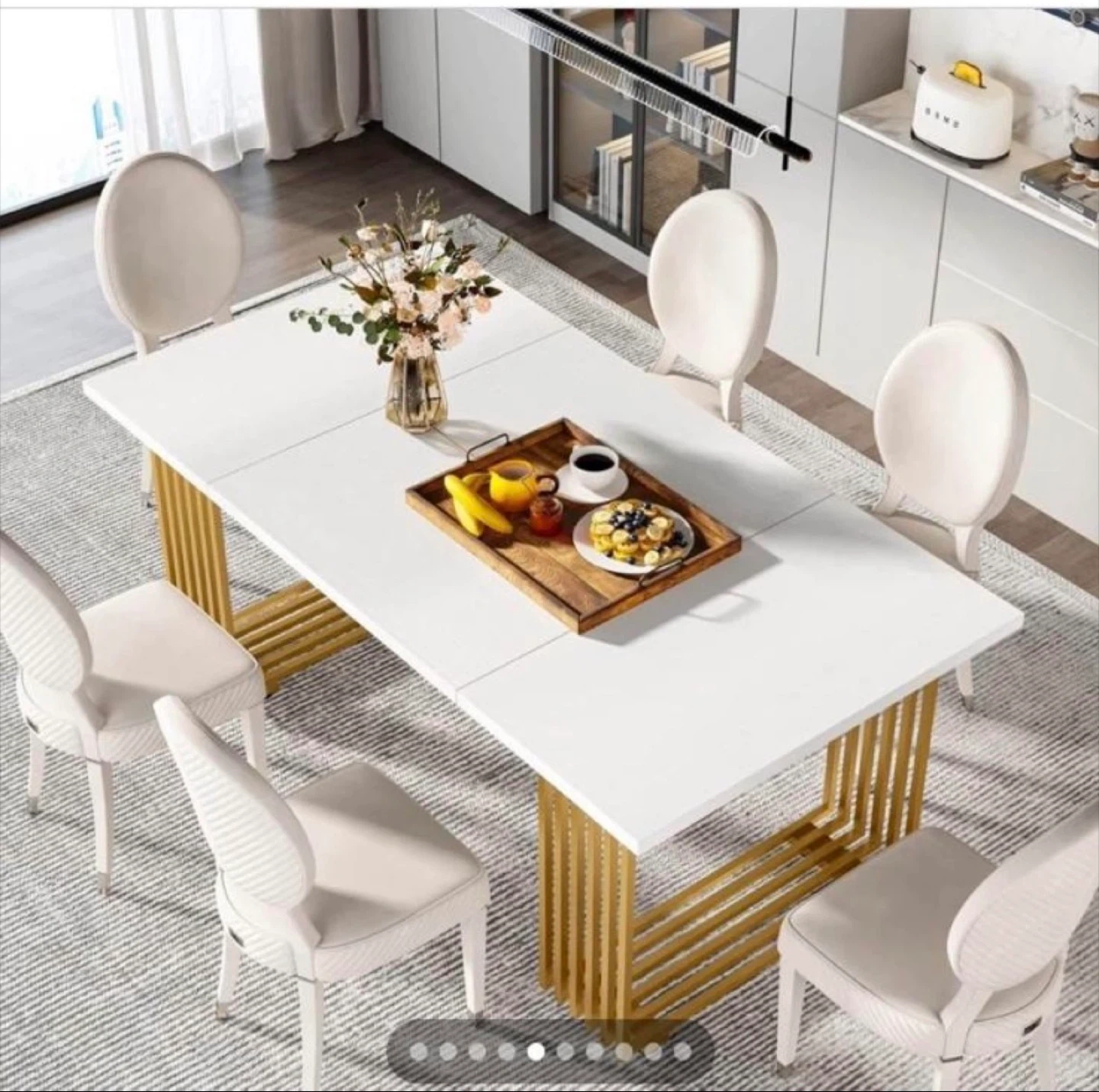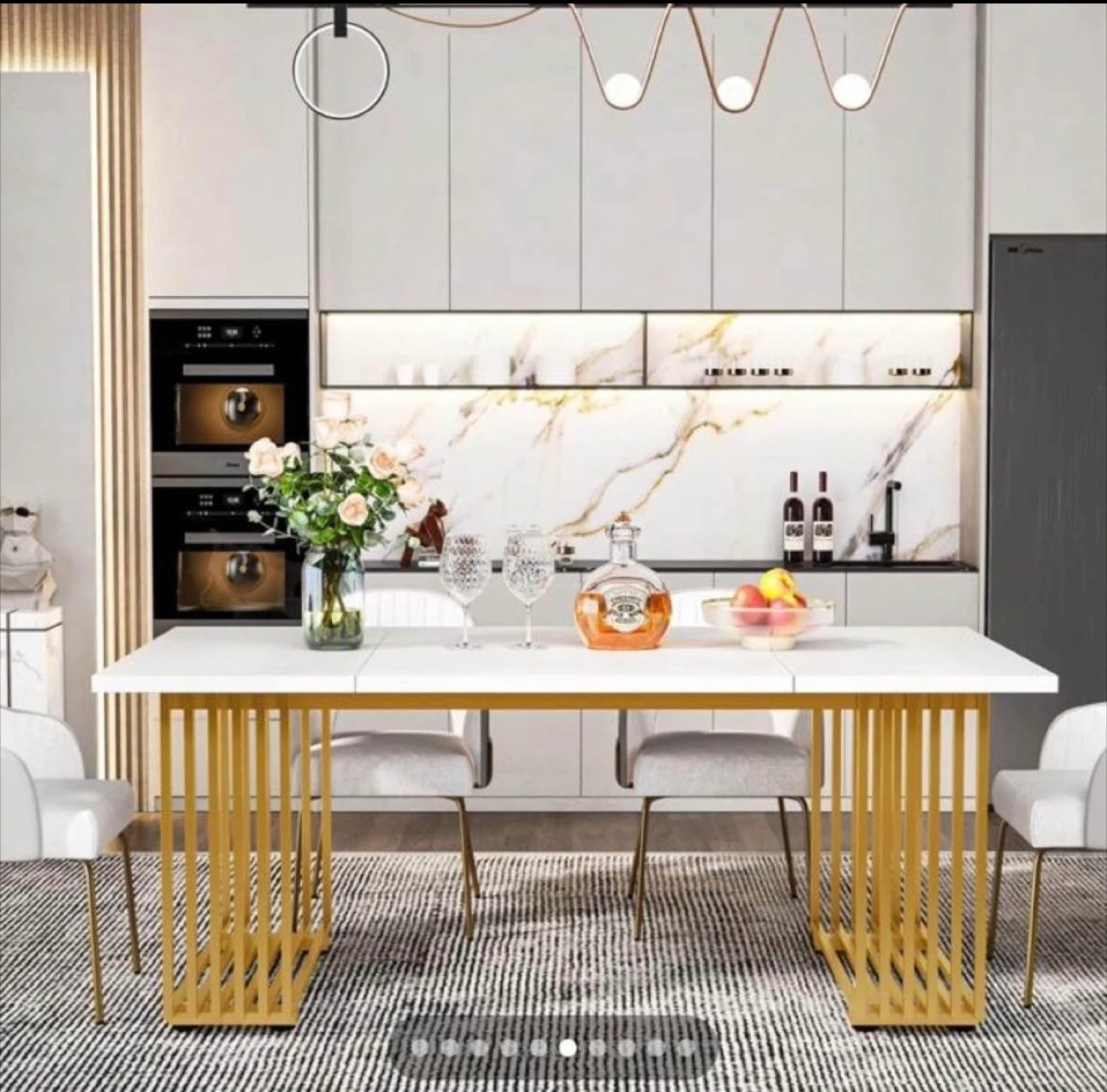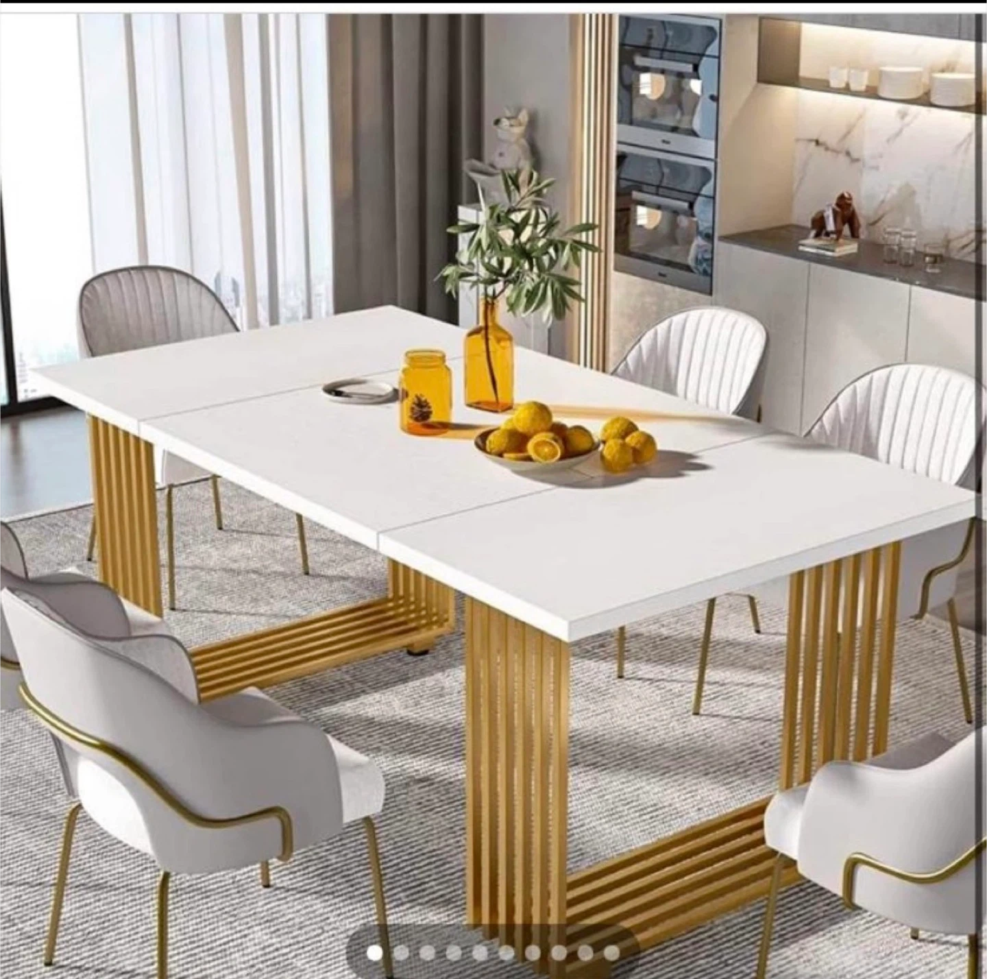 Selling a modern dining table with a white top and gold legs. It's in great shape and would look fantastic in any dining room or office!