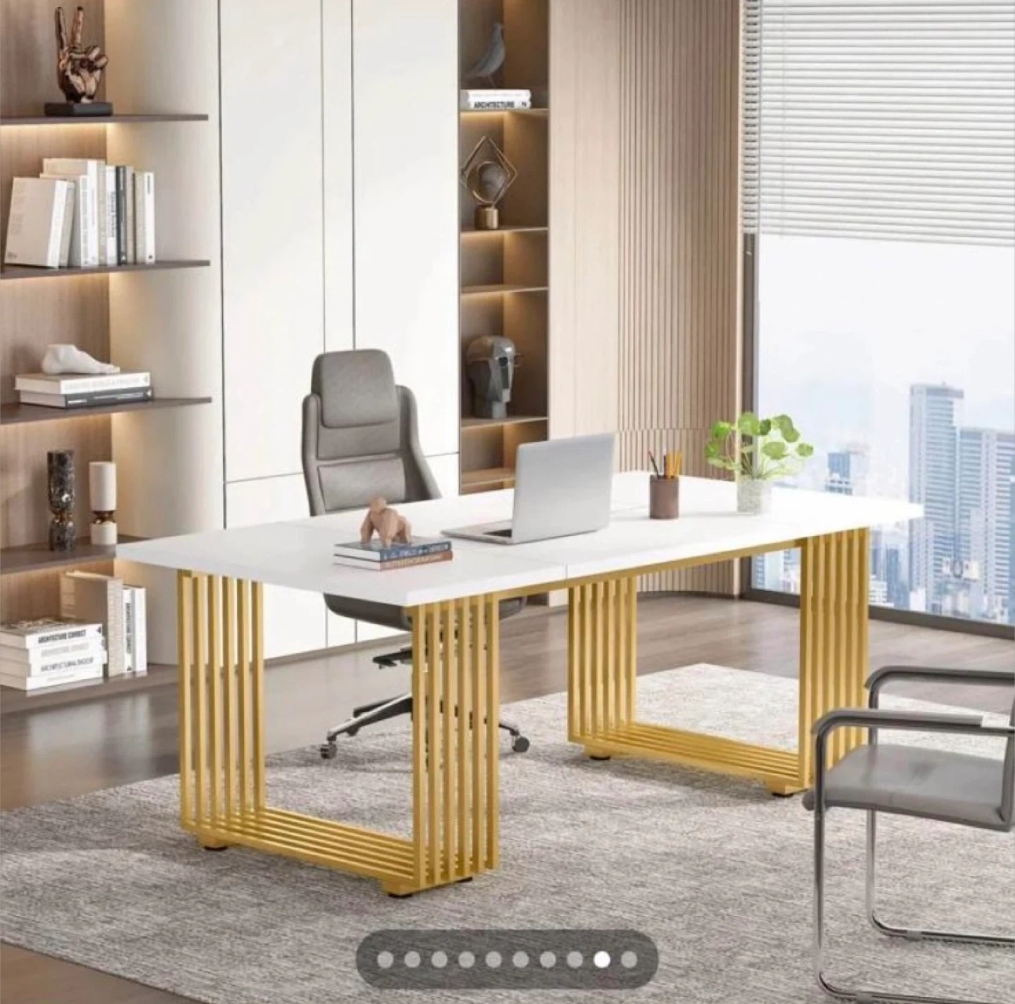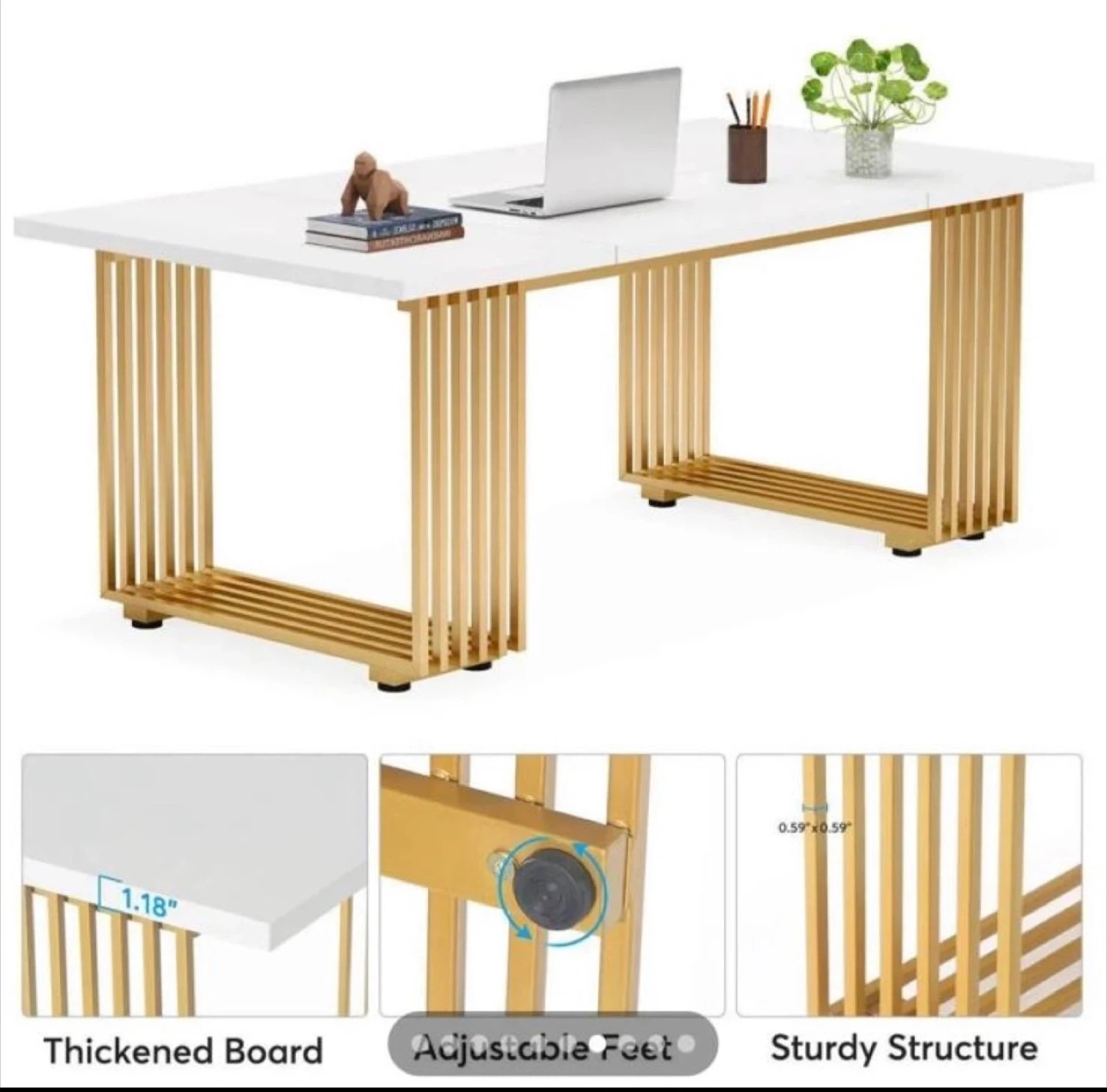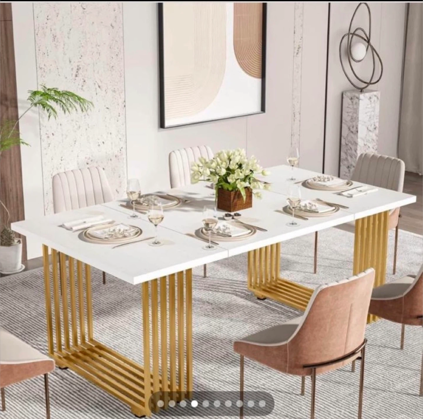 Selling a modern dining table with a white top and gold legs. It's in great shape and would look fantastic in any dining room or office!