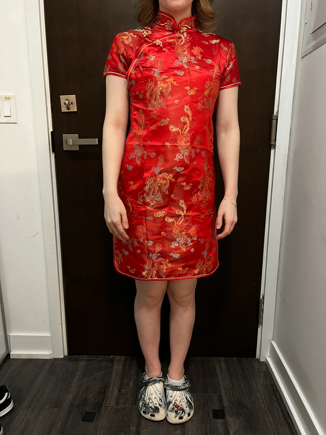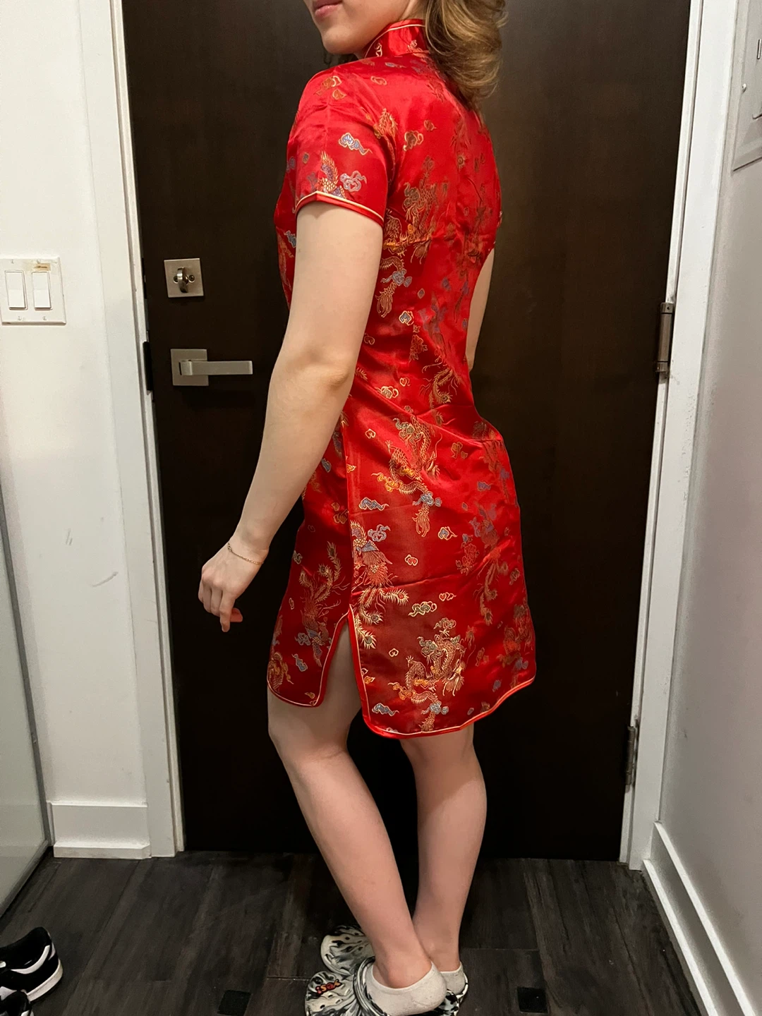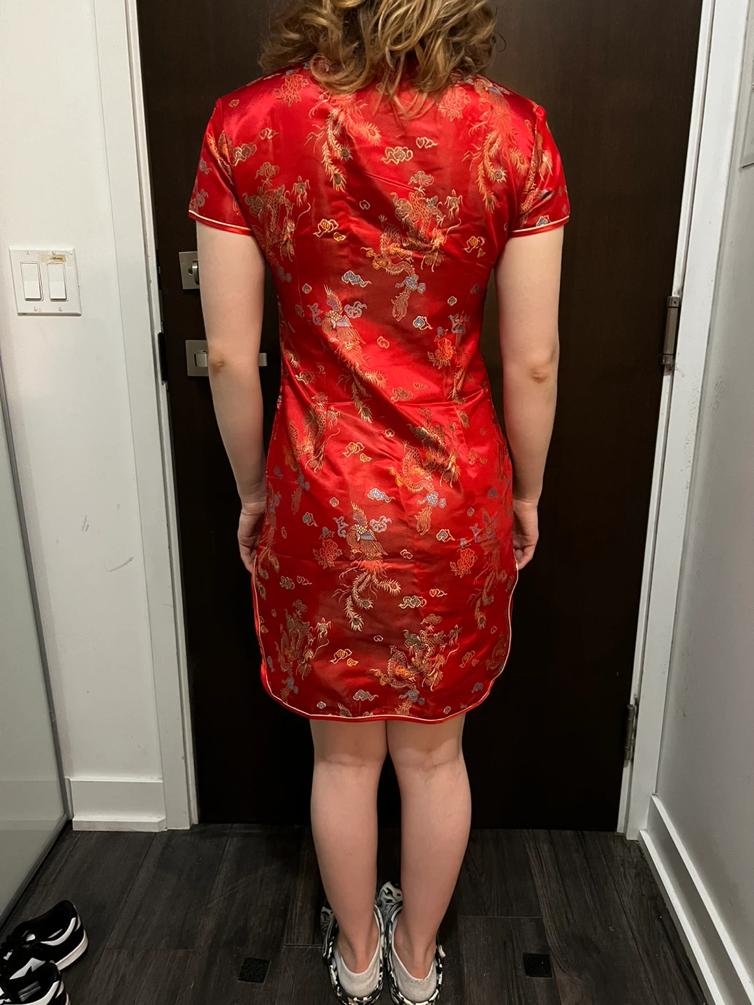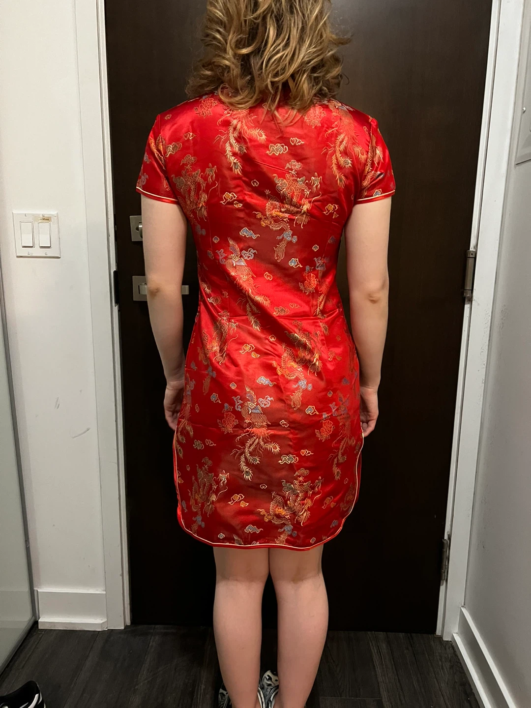 A lovely red dress with a Chinese-inspired design! It features a vibrant red colour with intricate dragon and cloud patterns. The dress has a short, fitted style with a mandarin collar and side slits. Perfect for a special occasion or adding a touch of cultural flair to your wardrobe