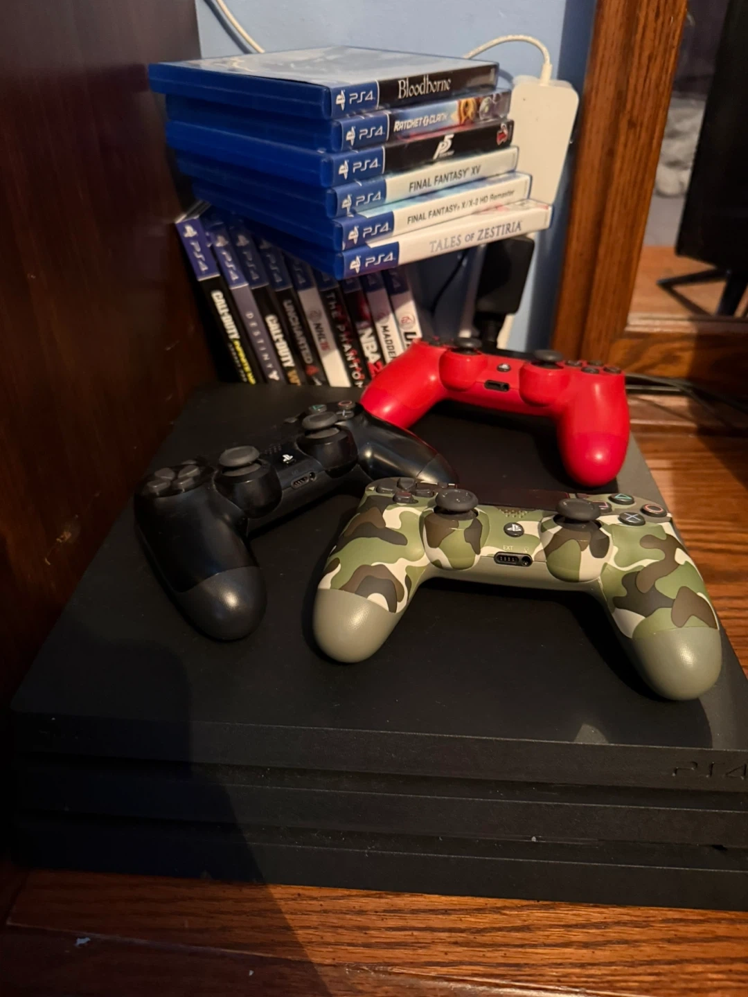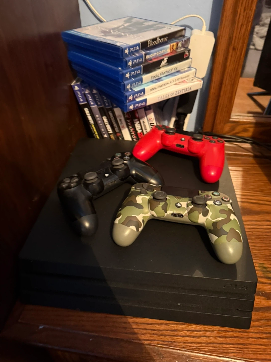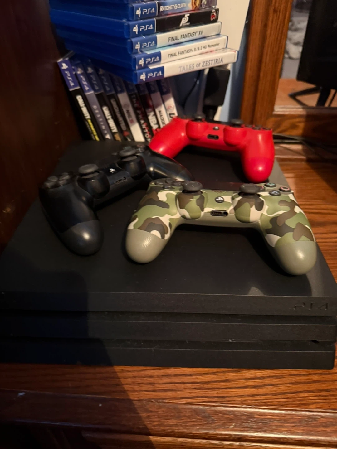 Selling a PlayStation 4 Pro with three controllers. Includes a black controller, a red controller, and a green camo controller. Great for gaming! and 15 games included