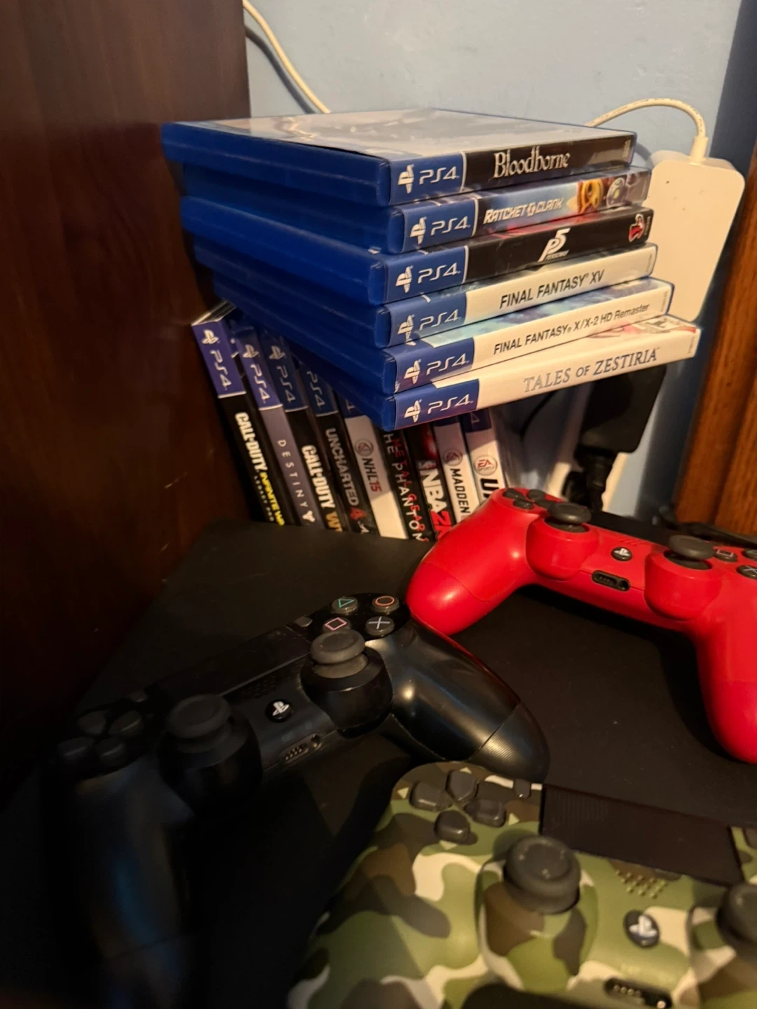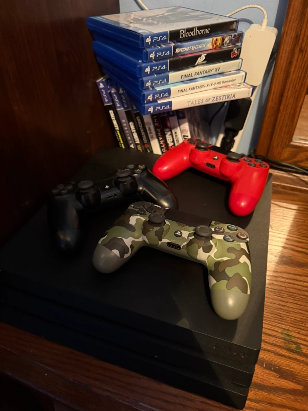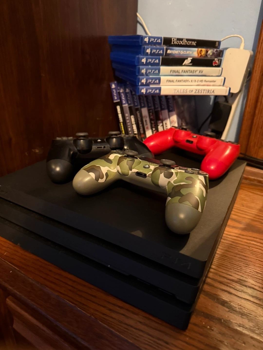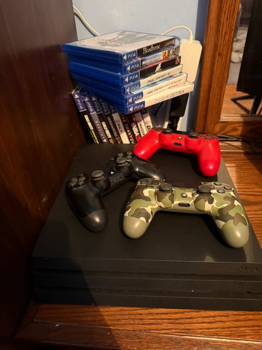 Selling a PlayStation 4 Pro with three controllers. Includes a black controller, a red controller, and a green camo controller. Great for gaming! and 15 games included