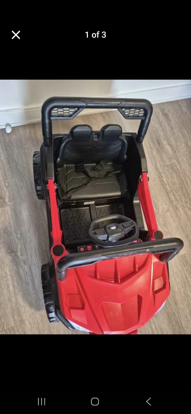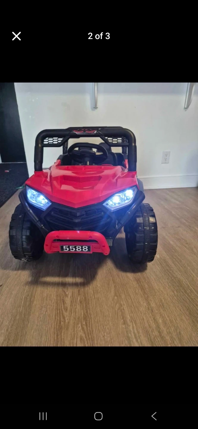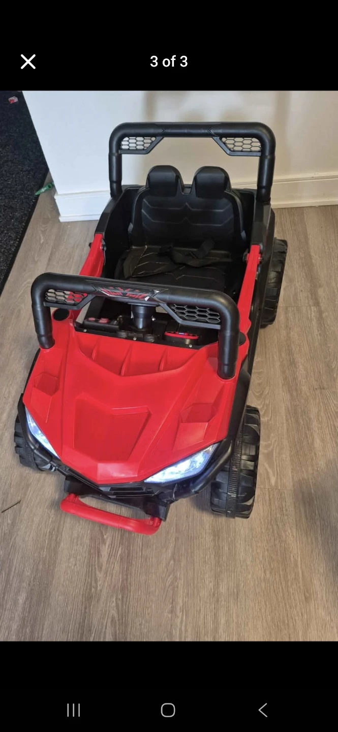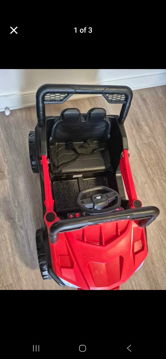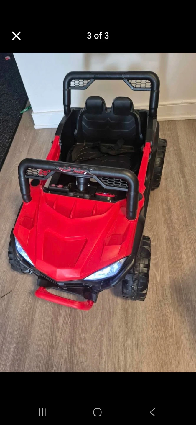 Selling a fun red ride-on car for kids! It has a rugged design and looks like a mini off-road vehicle. Perfect for little adventurers to cruise around in.