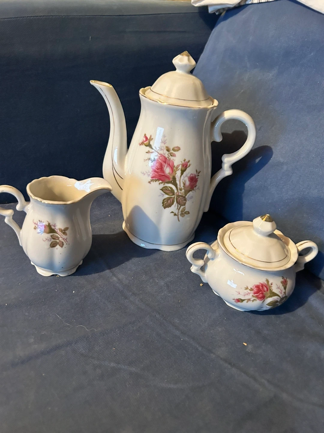 Selling a lovely vintage musical tea set marked "Tea for Two" and "Made in Japan"! It includes a teapot, a creamer, and a sugar bowl, all decorated with pretty pink roses. It would be a charming addition to any collection