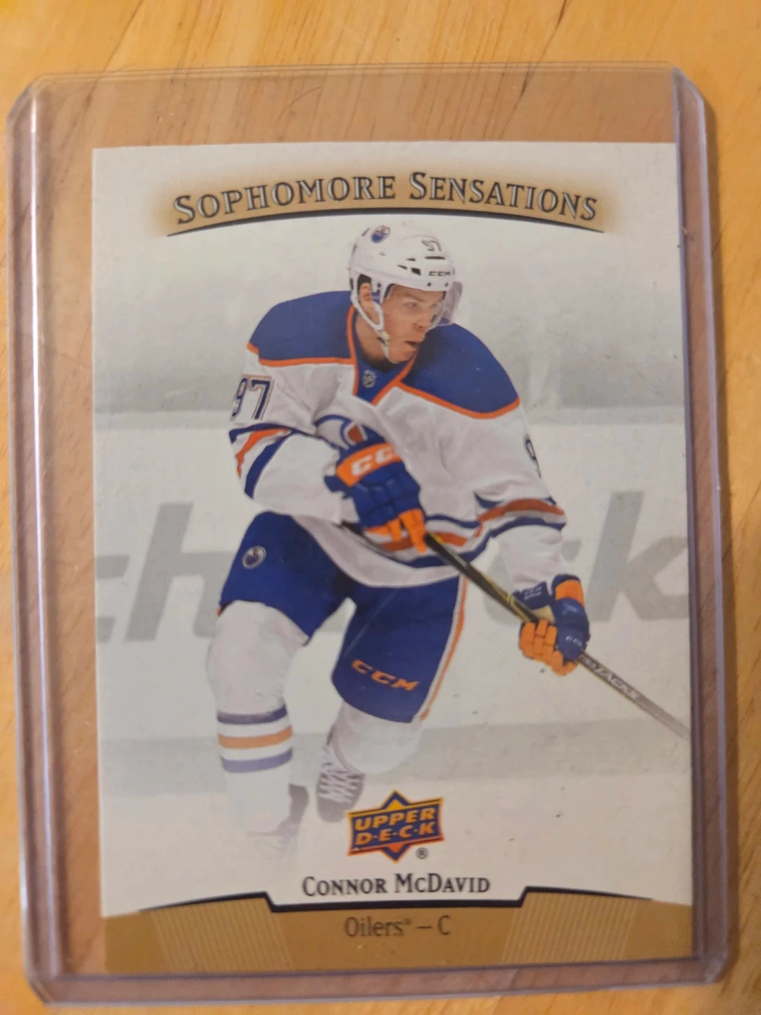 Selling a Connor McDavid Upper Deck hockey card. It's from the Sophomore Sensations series and features McDavid in his Oilers jersey. A great addition for any hockey card collector!